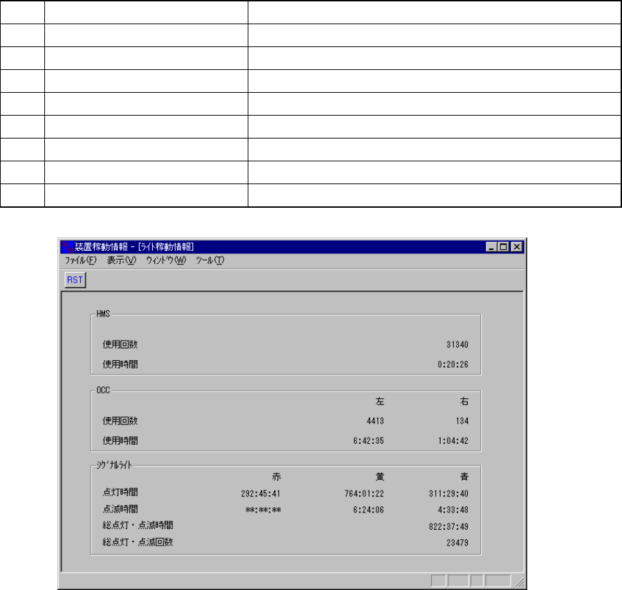 10 - 15 10-4-4. ライト稼動情報 ライト稼動情報 ライト稼動情報 ライト稼動情報 メニューバーの [ ウィンドウ( W )→ ライト稼動情報 ] を選択すると 、図 10-4- 4-1 が表示さます 。 NO NO NO NO 項目 項目 項目 項目 内容 内容 内容 内容 1 HMS使用回数 HMSが使用された回数の累計。 2 HMS使用時間 HMSが使用された時間の累計。 3 OCC使用回数 OCCが使用された回数…
