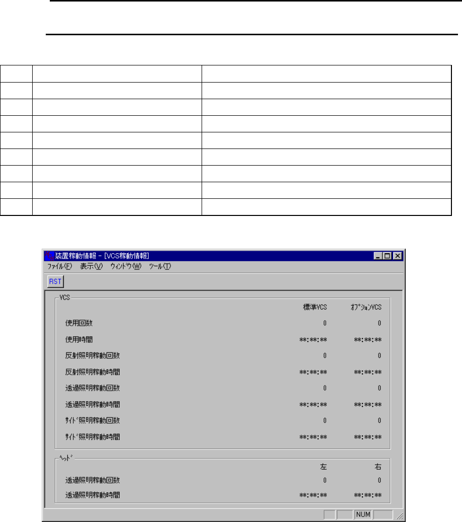 10 - 17 10-4-6. VCS稼動情報 VCS稼動情報 VCS稼動情報 VCS稼動情報 10-4-6-1. VCS稼動情報 VCS稼動情報 VCS稼動情報 VCS稼動情報 ドライバ稼動情報 画面を表示 している時にメニュー バーの[ツー ル( T )/ リセット]を選択す る と以下のダイアログが表示されます。 VCS 稼動情報は 稼動情報は 稼動情報は 稼動情報は KE-2020,2040 のみ対象です…