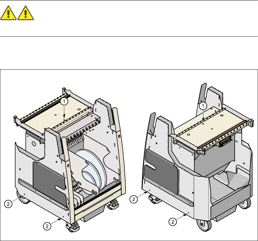 Æ Vyšroubujte závěsné šrouby z plochy stolu vozíku součástek.