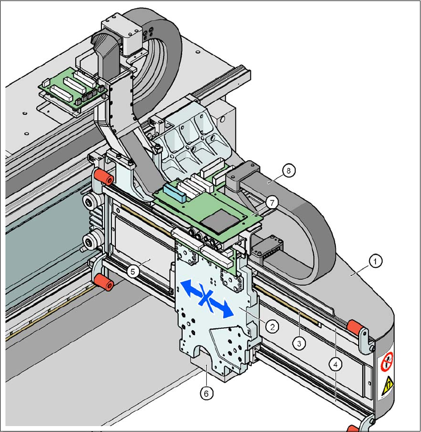 用户手册 SIPLACE D3 3 贴片机的技术数据 源自软件版本 SR.605.xx 07/2008 英文版 3.6 悬 臂系统 119 3.6.2 X 轴的结构 3 图 3.6 - 2 X 轴的结构 (1) 悬臂 (2) 带有 X 轴线性马达的贴片头座 (初级部分) (3) 线性距离测量系统 (4) 导向系统 (5) 永磁体 ( X 轴线性马达的次要部分) (6) 副悬臂照相机 (7) 贴片头控制板 (8) 电缆和软管支架