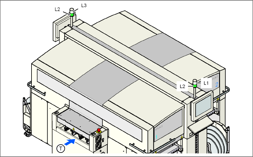 用户手册 SIPLACE D3 5 操作人员的任务 源自软件版本 SR.605.xx 07/2008 英文版 5.3 注意工作状态指示灯 261 5.3 注意工作状态指示灯 指示灯用于显示贴片机的工作状 态和故障情况。 5.3.1 功能说明 5 图 5.3 - 1 工作状态指示灯 L1 故障指示灯 (白色,右侧) L2 工作状态指示灯 (绿色,两个灯同时开) L3 故障指示灯 (白色,左侧) TP C B 传送方向 5.3.2 一般工作…