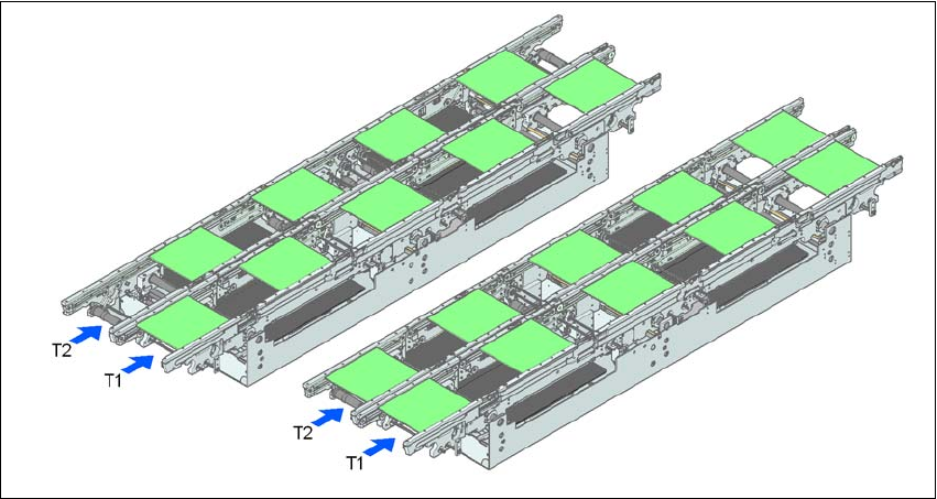 传送轨道 1 和 2 上的 PCB 同步移至传送导轨上(即传送导轨同步控制,但彼此独立)。要在传送