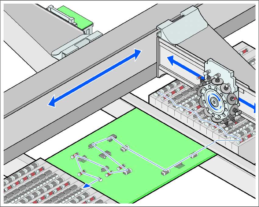 贴片头从料车上的固定供料器组件或矩阵式料盘交换器的料盘中取出元件,并贴装在同样静止的