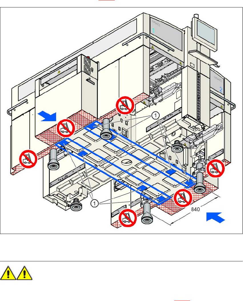 4 安装和试运行 SIPLACE D3 用户手册 4.3 安装贴片机 源自软件版本 SR.605.xx 07/2008 英文版 198 → 确保抬升贴 片机时,叉子的载荷均匀分配。在叉 子和贴片机之间应有一个坚固的支 承,这样 可以防止贴片机在抬升时倾翻。这 样做还可以防止将载荷加到贴片机 的一个支脚上,以免贴 片机支脚的固定装置变形。我们建 议在抬升机贴片时,应另安排一人 观察整个过程,确保贴 片机被叉车铲起时,不会向一侧倾 翻。 →…
