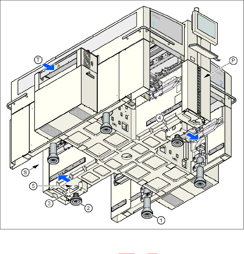 4 安装和试运行 SIPLACE D3 用户手册 4.3 安装贴片机 源自软件版本 SR.605.xx 07/2008 英文版 200 4.3.4.1 预设贴片机支脚的高度 首先预设贴片机中部支脚。隔室须 根据贴片机高度,固定在贴片机底侧 相应的位置上。 将 PCB 传送高度设为 830 mm 4 如果 PCB 传送高度为 830 mm ,则无需垫块。 → 尽可能将贴 片机中部支脚拧进提供的螺纹中 (见图 4.3 - 3 中的 5 ,第…