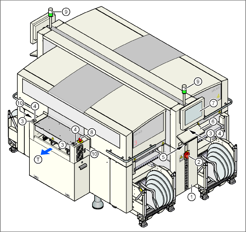 用户手册 SIPLACE D3 5 操作人员的任务 源自软件版本 SR.605.xx 07/2008 英文版 5.2 控制部件和显示装置 257 5.2 控制部件和显示装置 5.2.1 位置 5 图 5.2 - 1 控制部件和显示装置 (1) 电源侧的操作员面板 (7) LCD 触摸 屏 (2) 主电源开关 (8) EMERGENCY STOP (急停)按钮 (3) S top (停止)按钮 (黑色) (9) 指示灯 (4) S tar…