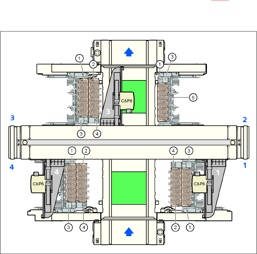 用户手册 SIPLACE D3 6 贴片机扩展部件 源自软件版本 SR.605.xx 07/2008 英文版 6.1 吸嘴交换器 291 6.1.2.3 6 段位器收集贴片头吸嘴交换器的位置 对于 6 段位器收集贴片头, 可以在位置 1 、 3 和 4 安装一或两个吸嘴交换器(图 6.1 - 8 中的 1 和 2 ) 。这样一来, 7 个吸嘴交换器总共可以容纳 42 个吸 嘴盘和 252 个吸嘴库。 6 图 6.1 - 8 6 段位器收…