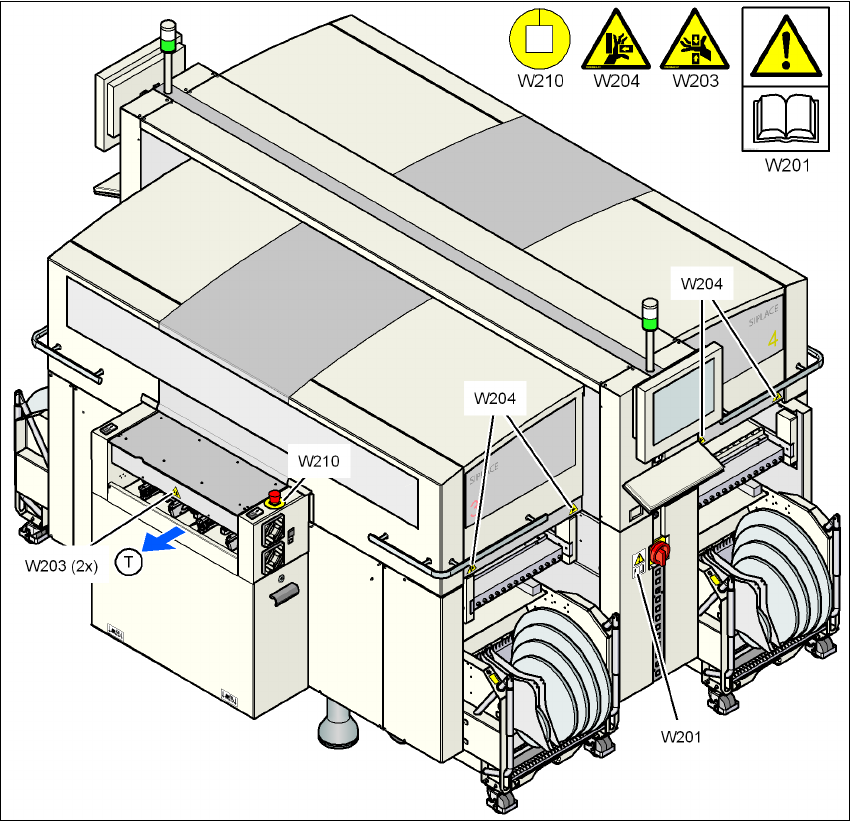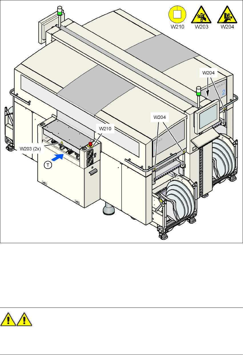2 安全操作 SIPLACE D3 用户手册 2.2 警告标签 来自软件版本 SR.605.xx 07/2008 英文版 40 图 2.2 - 2 贴片机上的警告标签 W203 、 W204 和 W210 - 第 2 部分 位置 W203 ,部件号 0300934 2-01 位置 W204 ,部件号 0300934 3-01 位置 W210 ,部件号 0300935 0-01 (T) PCB 行程方向 警告 2 → 不要使用含 磨料的清…
