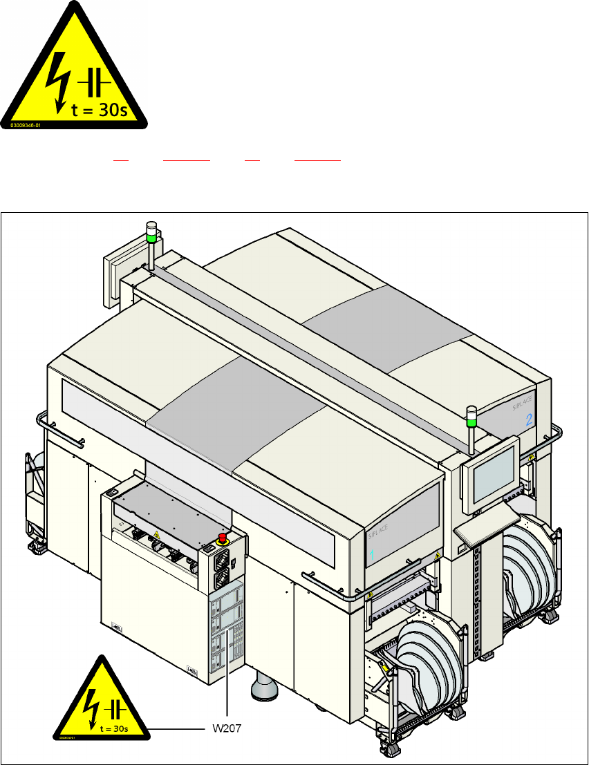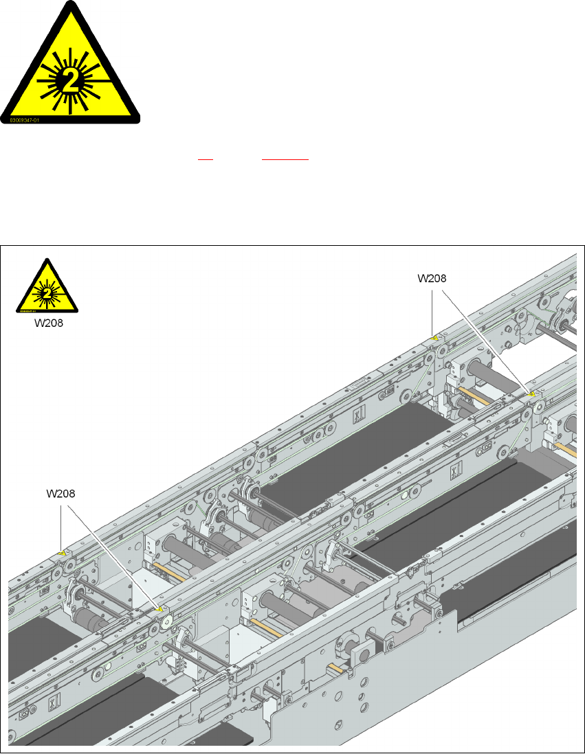 2 安全操作 SIPLACE D3 用户手册 2.2 警告标签 来自软件版本 SR.605.xx 07/2008 英文版 54 2.2.6 PCB 传送导轨上的警告标签 2 位置 W208" 二类激光 " ,位于第 54 页,图 2.2 - 13 中的 PCB 传送导轨之上,部件号 0300934 7- 01 (每台贴片机的编号:双传送 导轨: 4 ,单传送导轨: 2 ) 2 2 2 图 2.2 - 13 PCB 传…