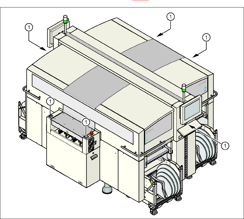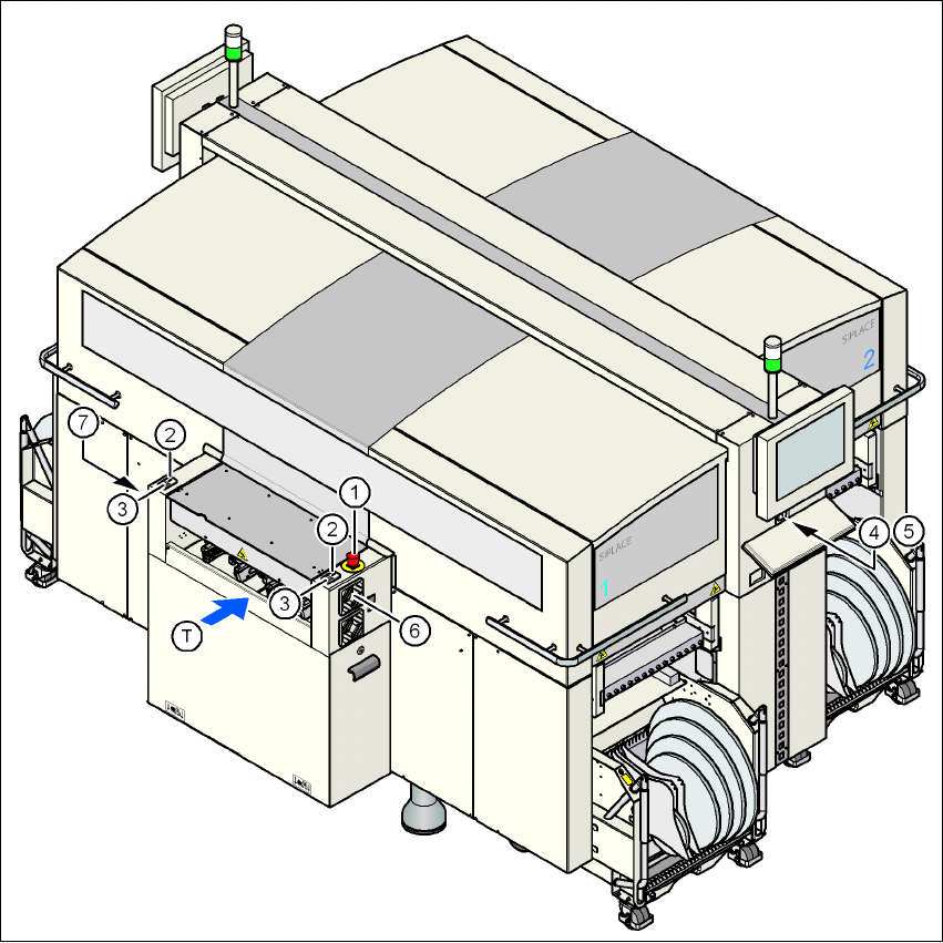 用户手册 SIPLACE D3 2 安全操作 来自软件版本 SR.605.xx 07/2008 英文版 2.6 安全设备 69 2.6.2 贴片机上的开关和按钮 2.6.2.1 贴片机上开关和按钮的位置 2 图 2.6 - 3 开关和按钮的位置 - PCB 输出侧视图 (1) 主电源开关 (2) 电源侧操作面板上的 St o p (停止)按钮 (黑色) (3) 电源侧操作面板上的 Sta r t (启动)按钮 (白色) (4) 电源侧操…