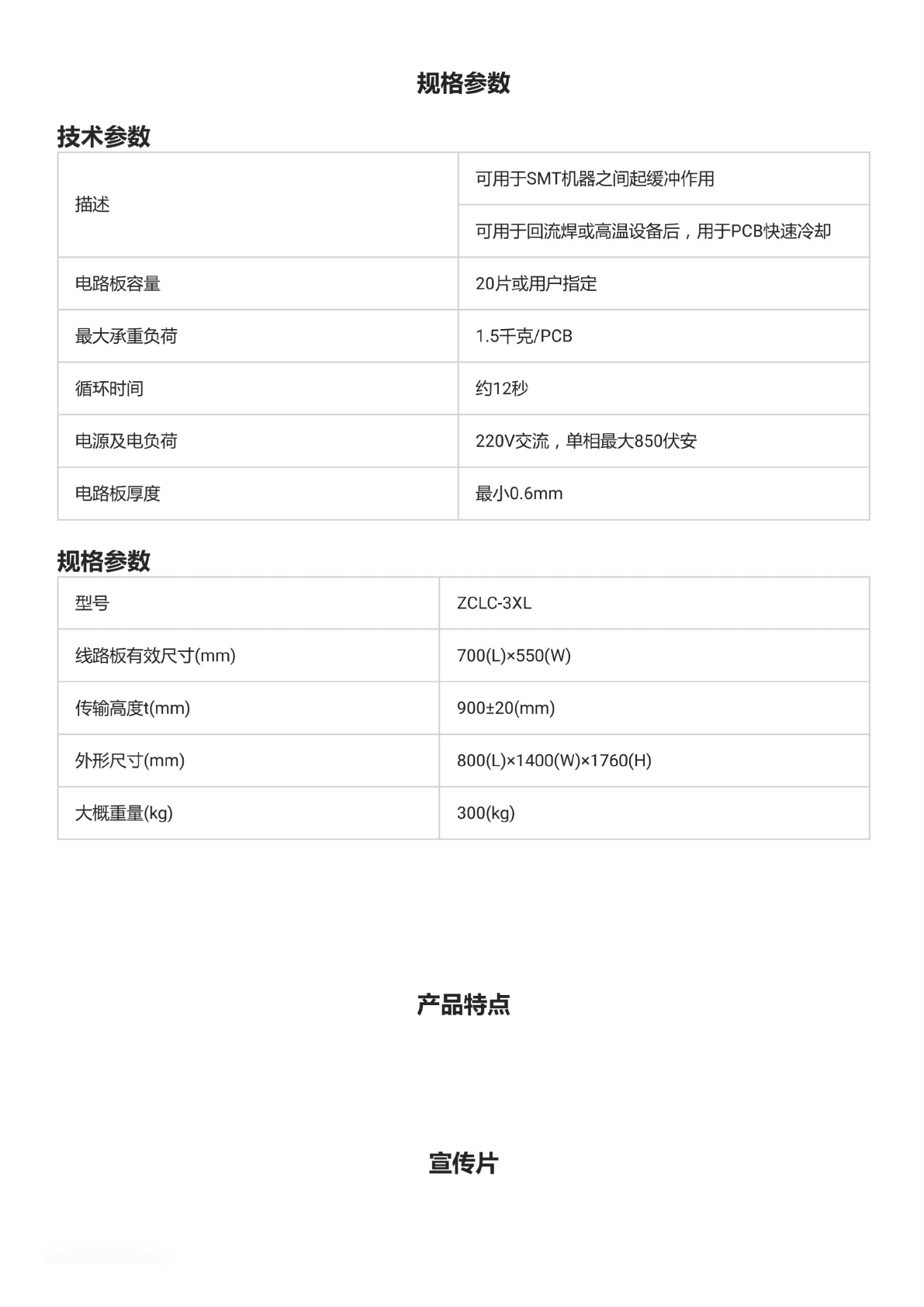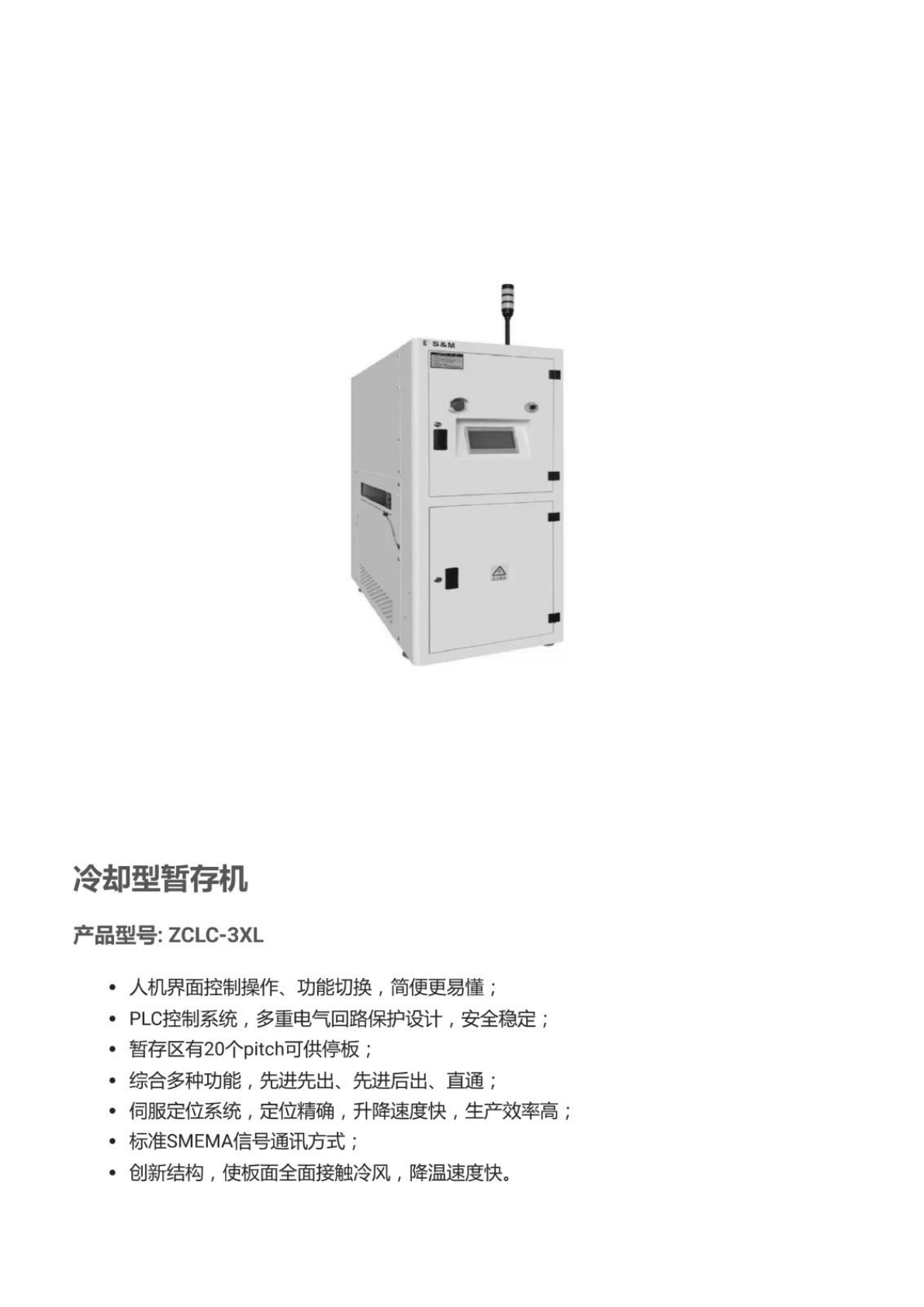 冷却型 暂存机 产品 型号: ZCLC-3XL • 人机界 面控制 操作、 功能 切换, 简便 更易懂 ; • PLC 控 制系统 , 多 重电气 回路保 护设计 , 安 全稳定 ; • 暂 存区有 20 个 pitch 可 供停板 ; • 综合多 种功能 , 先进 先出、 先进 后出、 直通 ; 伺 服定 位系统 , 定 位精确 , 升降 速度快 , 生产 效率高 ; • 标准 SMEMA 信 号通讯 方式; • 创 新结构 ,使…