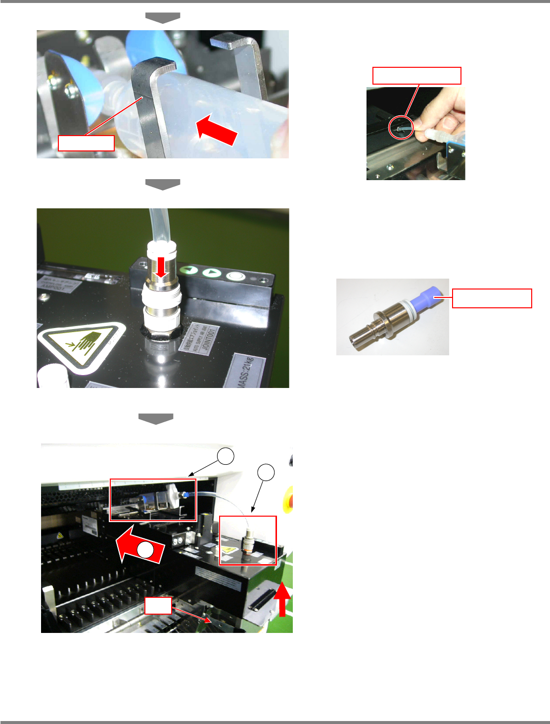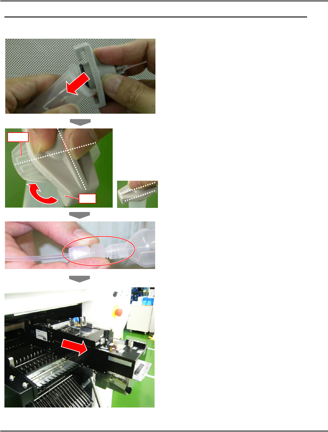 NPM-D 通用型转印装置 2.3 转印材料的安装 MFTU-EJM1D C-MB-02N-00 Page 2-9 5 在把配管插入软管导轨中的同时, 把注 射器安装在注射器座上。 6 将连接器软管的插头插入到耦合器中。 ∗ 不使用自动供给功能时,请将附带的 带盖子的 插头插入到耦合器中。否则,异物进 入到耦合 器里,可能会对自动供给功能有不良 影响。 7 将转印装置设置在运转位置。 ∗ 请在把通用型转印装置稍微往上抬起 的状态 下,把…