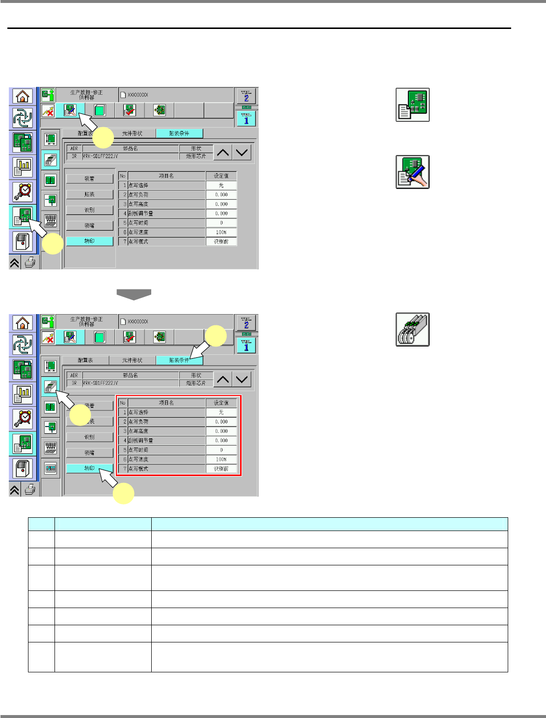 NPM-D 通用型转印装置 3.3 生产数据 Page 3-6 MFTU-EJM1DC-MB-0 3N-00 3.3 生产数据 3.3.1 实装条件 设定转印装置的实装条件。 1 按动第一级别的 。 2 按动第二级别的 。 3 按动第三级别的 。 4 按下 [ 贴装条件 ] 。 5 按下 [ 转印 ] 。 • 进行转印装置的动作数据输入、修正 。 No. 项目名 内容 1 点写选择 是转印动作的有无。(有 : 有转印、无 : 无转印) …