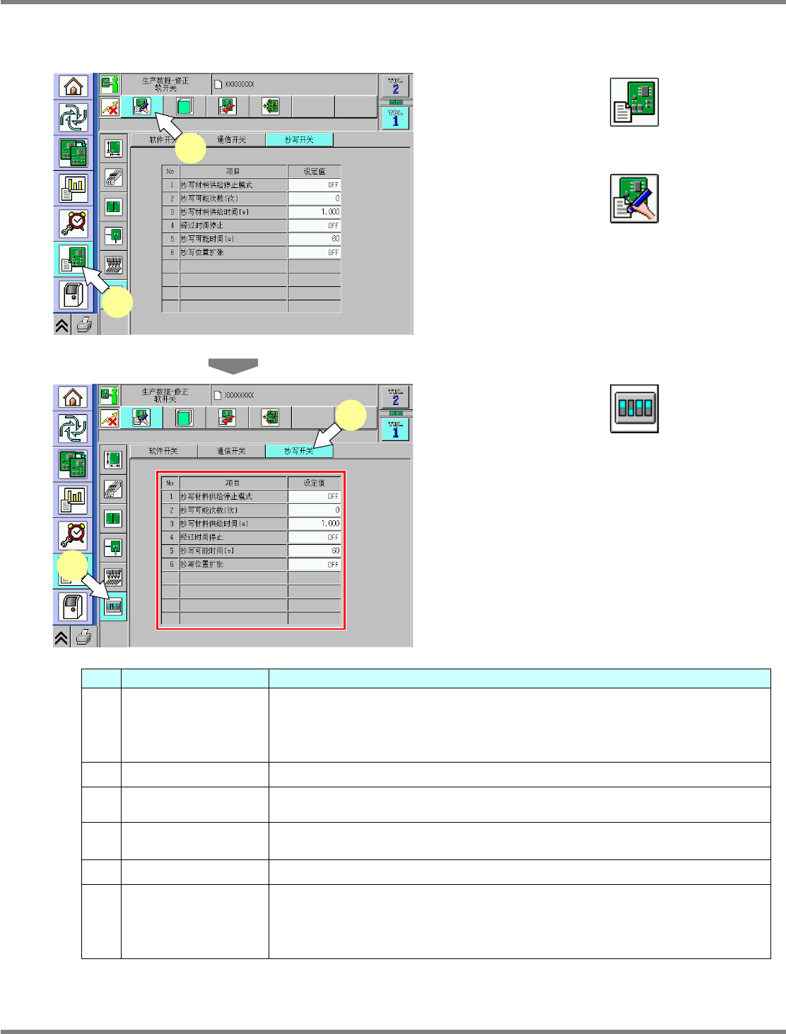 NPM-D 通用型转印装置 3.4 机器数据 Page 3-8 MFTU-EJM1DC-MB-0 3N-00 3.4 机器数据 3.4.1 设定 设定转印装置的参数。 1 按动第一级别的 。 2 按动第二级别的 。 3 按动第三级别的 。 4 按下 [ 动作参数 ] 。 5 按下 [ 时间 ] 。 No. 项目名 内容 1 膜厚形成保持时间 [s] 设定生产中的搔取动作 + 成膜动作的时间间隔。 到了设定的时间后, 就自动执行 搔取动作…