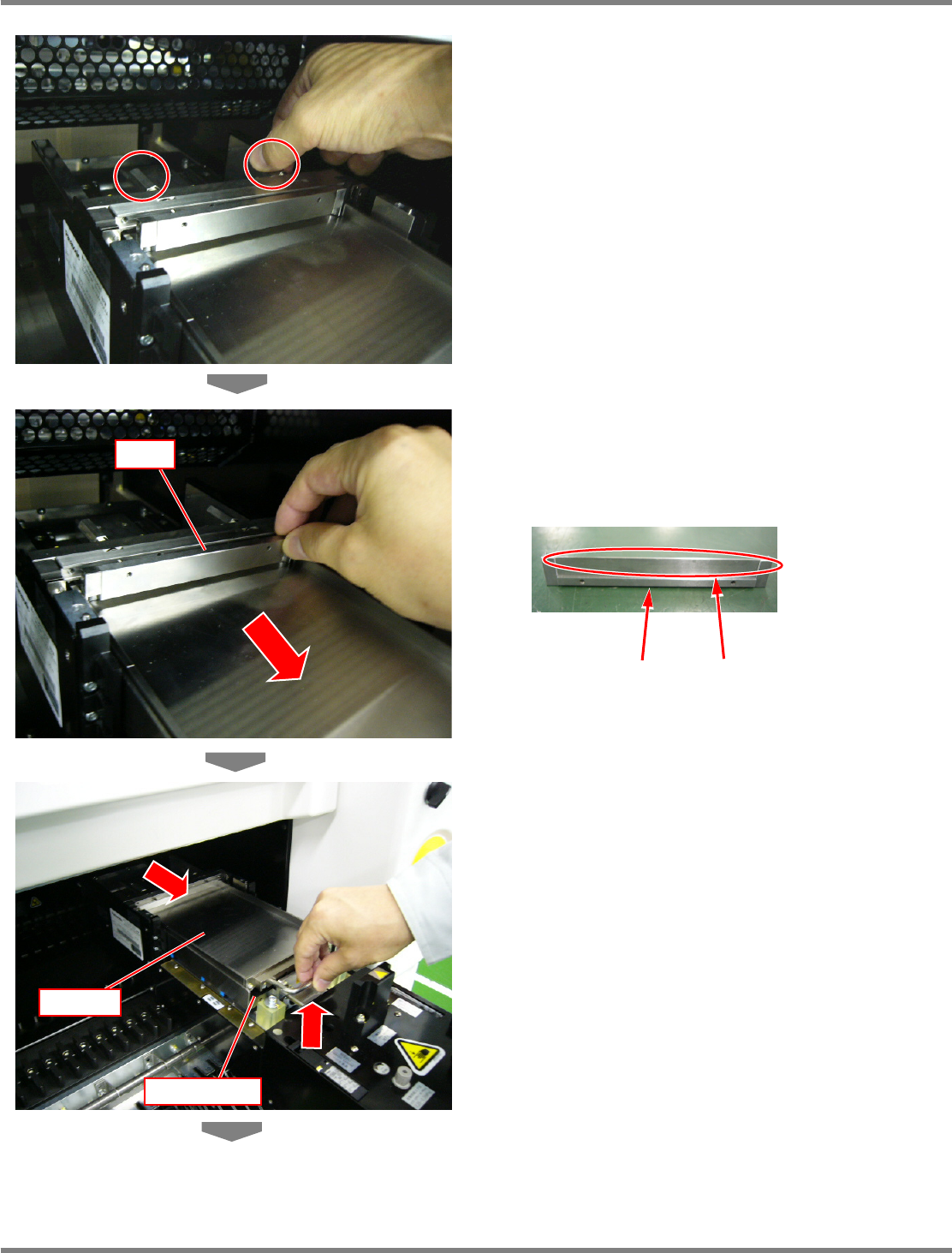 NPM-D 通用型转印装置 5.2 24 小时检查( 日常) Page 5-6 MFTU-EJM1DC-MB-0 5N-00 5 松开刮板的安装螺丝 ( 2 处)。 = 注意 = 为了使得松开时左右均匀,请左右交 互地松开。 用手无法松开时,也可以使用工具。 6 将刮板取下。 • 请注意刮板的角不要撞到转印台。另 外,在使 用刮板时,请注意不要将物体撞到成 膜部。若 成膜部受到损伤,则有可能无法安定 地成膜。 MFTU-NPM-PIC0…