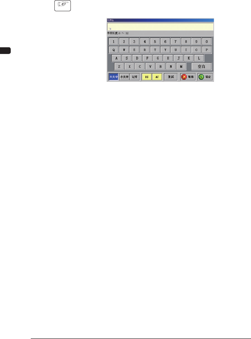 1OM-1513 2-16 第二章3.识别界面 3.2 字符数据的输入 Procedure (1) 在操作界面中,按输入字符数据项目的按钮。 显示字符数据的输入界面。 F1B14 (2) 用输入界面上的键输入。 在输入界面上端的显示框内显示所输入数据。 大写、小写、符号的输入切换分别使用以下按钮。 [ 大文字 ( 大写 )] 按钮 : 输入大写时按该按钮,按钮变为蓝色,键变 为大写输入状态。 [ 小文字 ( 小写 )] 按钮…