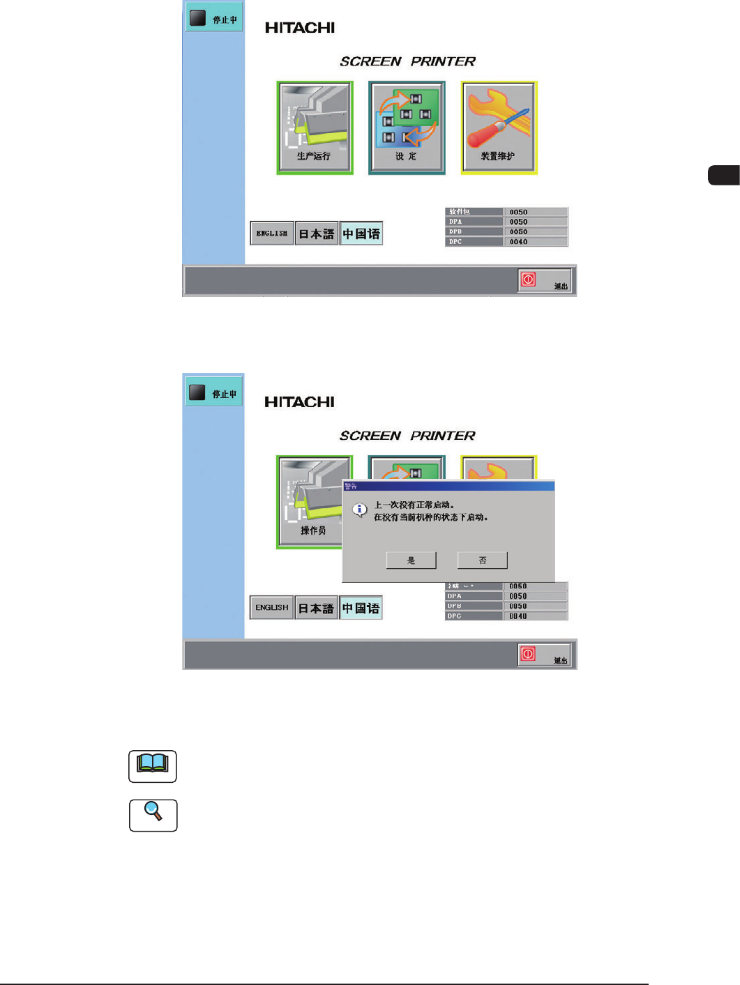 1OM-1513 第三章1.生产运行 3-7 1.3.2 登录 自检测一结束,[POWER ON] 按钮变为黄绿色,在触摸屏上显示初始界面。 F1C7 上一次没有正常启动时,显示警告窗口。 F1C8 按下 [ 是 ] 按钮,在当前机种没有被选择的状态下启动。 Note 当前机种数据有问题时,按下 [ 是 ] 按钮,有时就能正常启动。 无法正常启动时, 请联系株式会社日立高新技术的营业部门或销售代理店。 Reference 初始界…