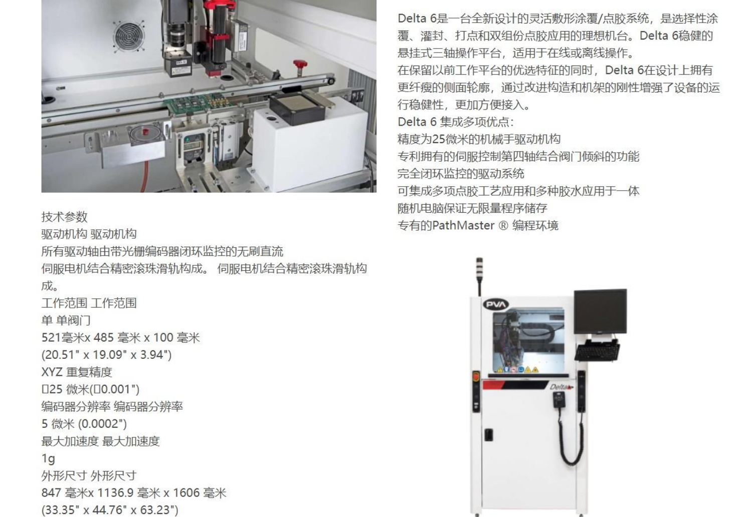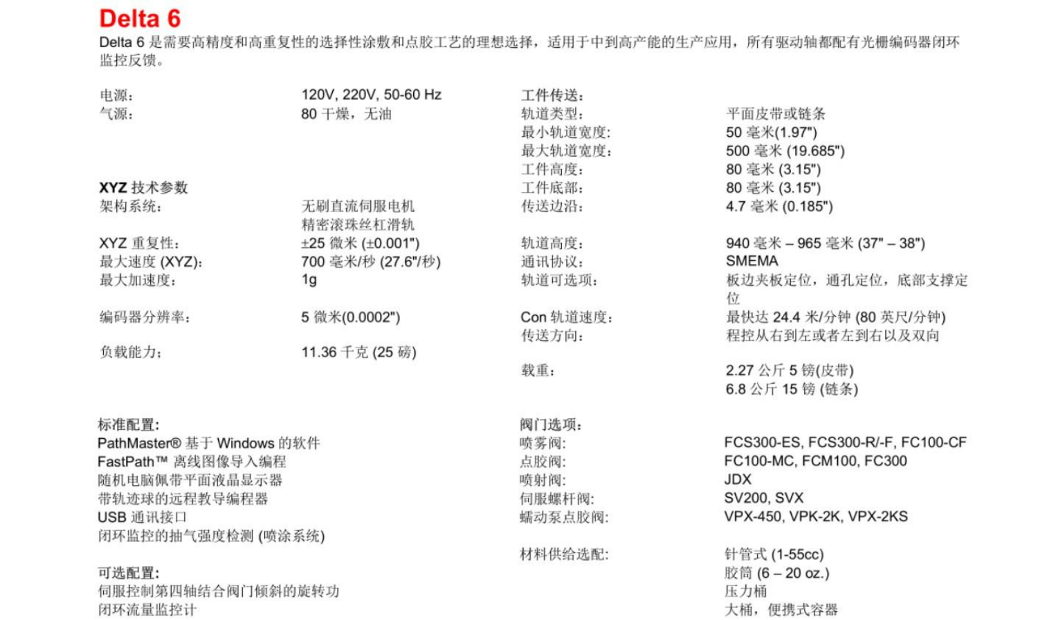 Delta 6 Delta 6 足需要高稍度和高重复性的选择性涂敖和点胶工艺的理想选择 , 适用于中到高产能的生产应用 , 所有驱动轴都配有光柵编码器闭环 监控反馈 。 工件传送 : 轨道类型 : 最小轨道宽度 : 最大轨道宽度 : 工件高度 : 工件底部 : 传送边沿 : 电源 : 120 V , 220 V , 50 - 60 Hz 80 干燥 , 无油 气源 : 平面皮带或链条 50 奄米 ( 1.97 " ) 500 …