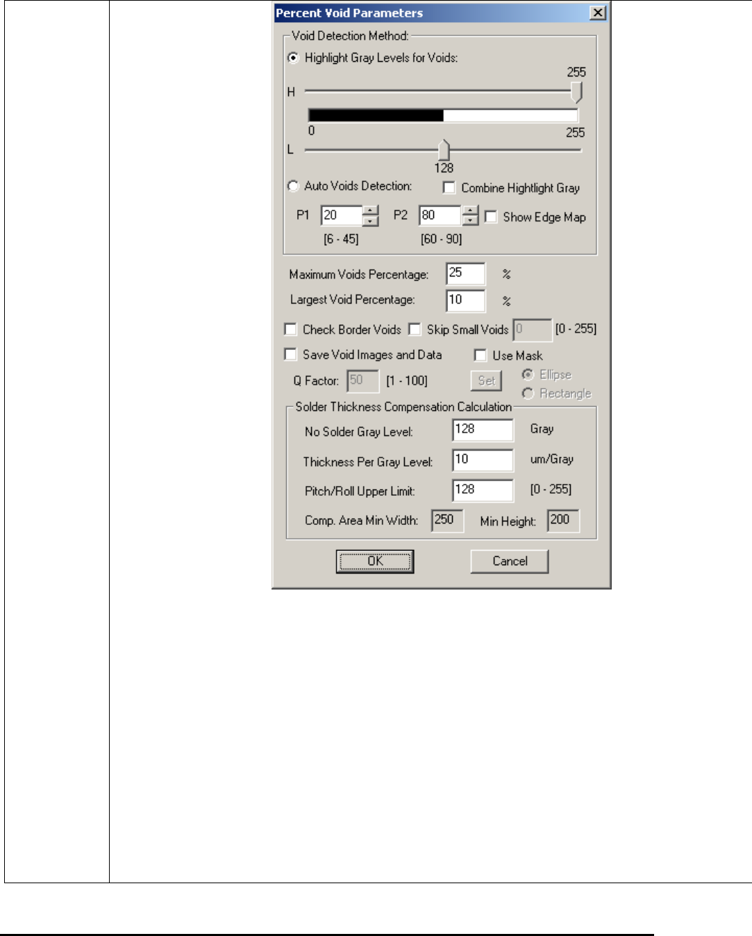The Maximum Voids Percentage sets a pass/fail percentage for the Percent Void inspection.