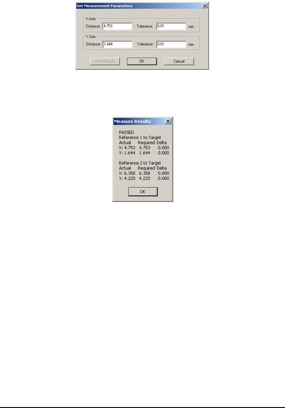 14 - 14 A dvance Inspection Features Setup the nominal distance from the reference point to the part, and establish an allowable tolerance for each distance. On the Set Measurement Parameters dia log for U1, pressing the…