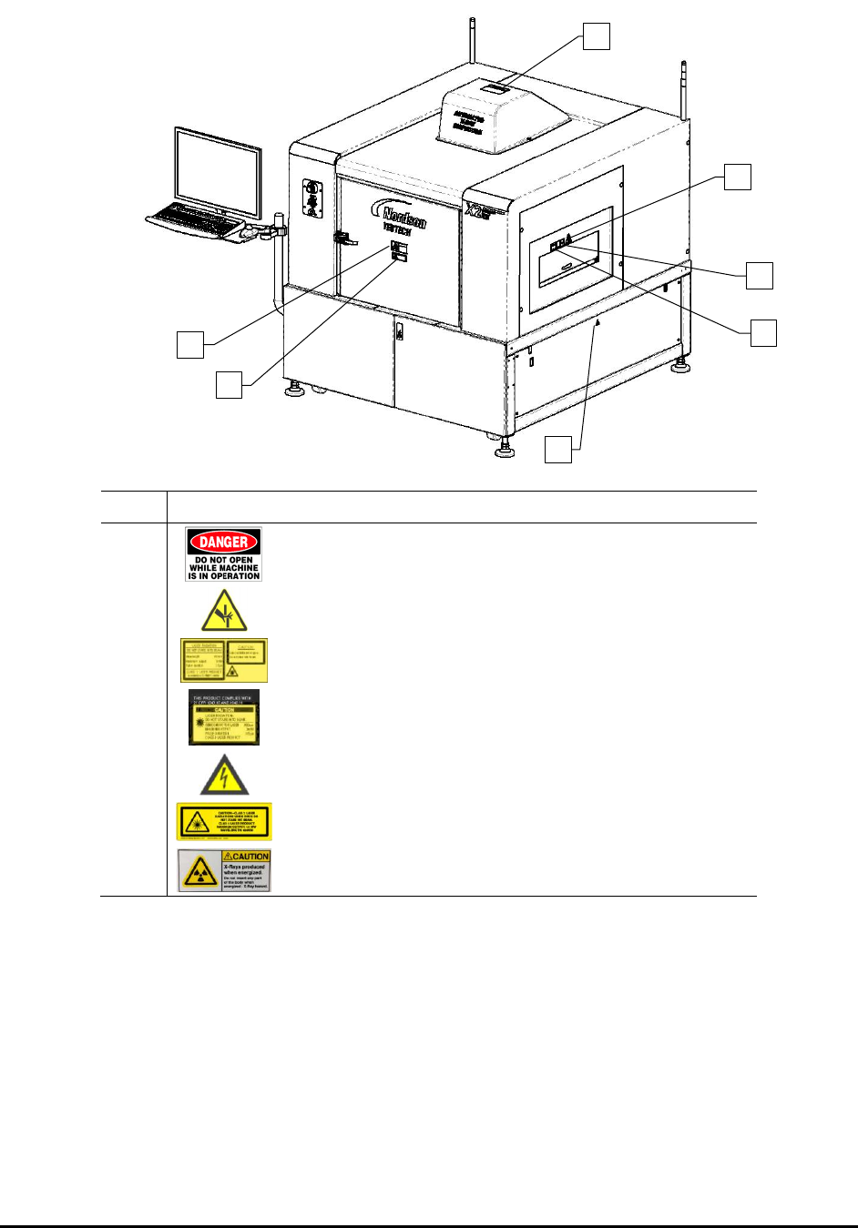 2-2 Safety Item Description 1 P/N: 7223284 Physi cal Haz ard 2 P/N: 11599 Mov ing Parts Present 3 P/N: 11312 Laser H azard 4 P/N: 11312 Laser H azard 5 P/N: 70-0050- 00 Shock Hazard 6 P/N: 7254753 Lase r Hazard ( X3 Only…