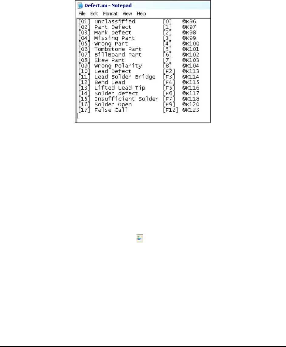 Inspection and De fect Revie w Step by S tep 5-9 The following is a sample Defect.ini file: [01] Unclassified [02] Missing Part@S [03] Wrong Part@S [04] Tombstone Part [05] BillBoard Part [06] Skew Part [07] Wrong Polari…
