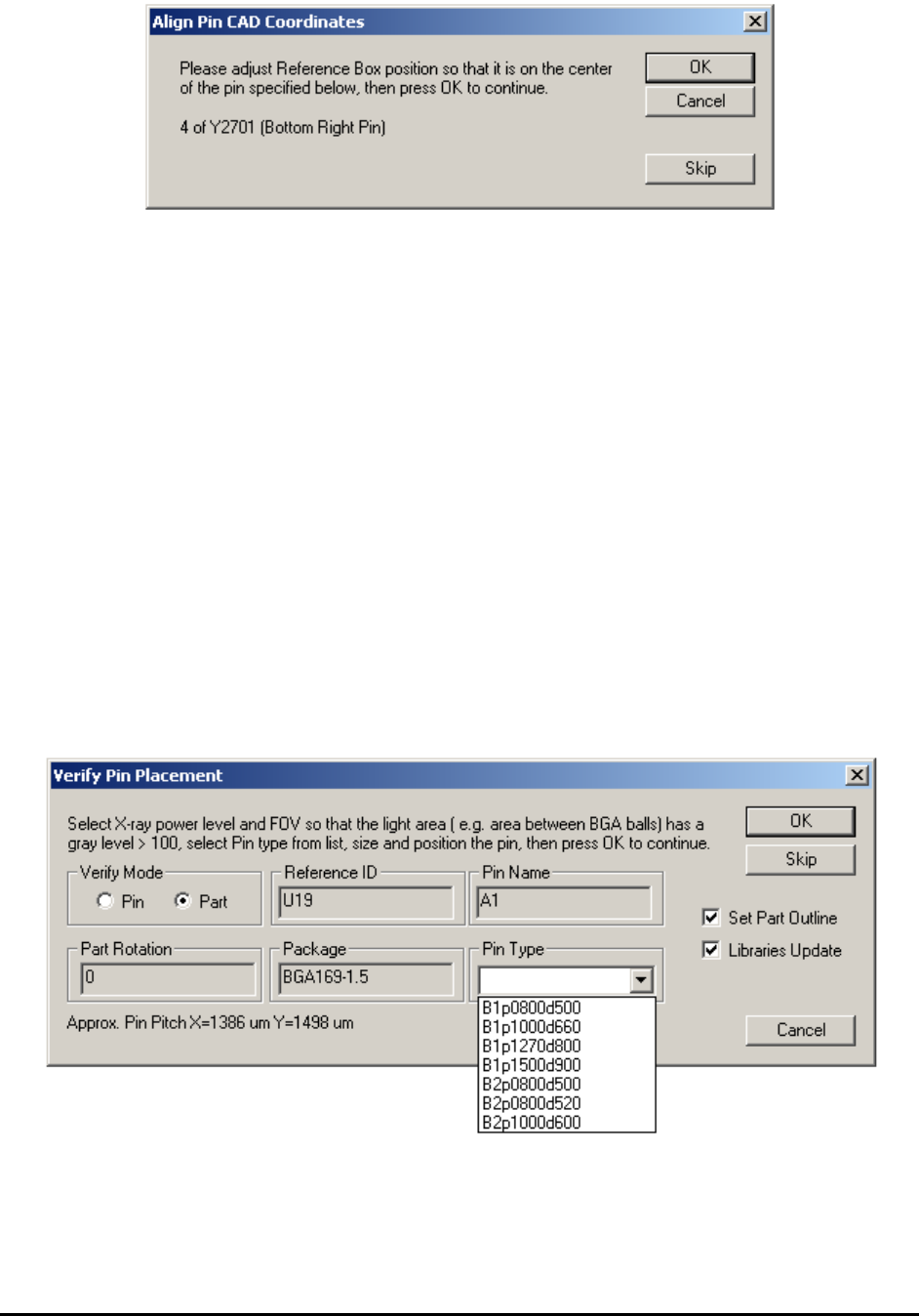 displays for the first pin (or solder joint) of each part to verify (or adjust) the pin’s XY positions.