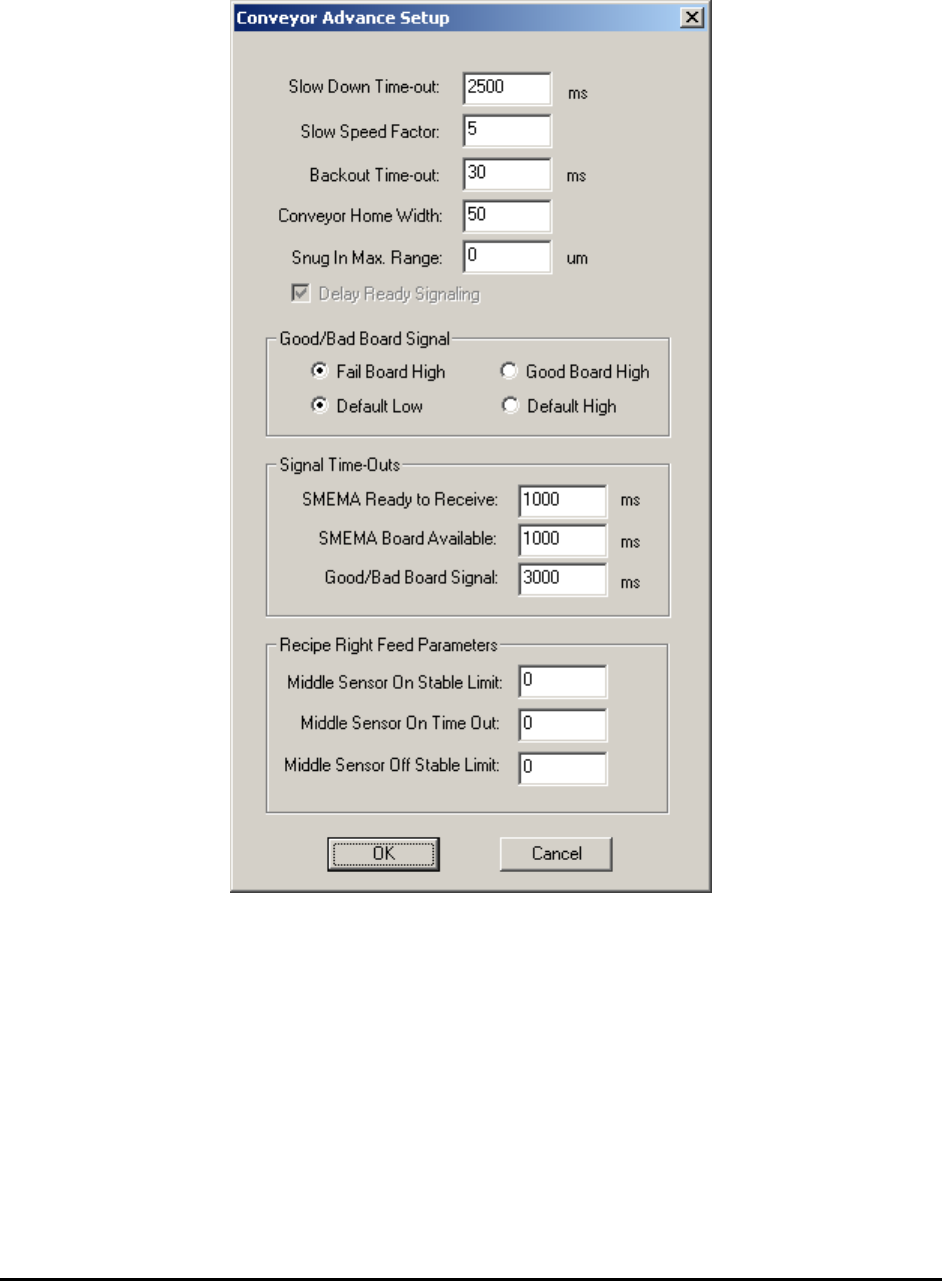 9-2 SMEMA Convey or S etup The Ignore Down Stream checkbox will ignore the downstream conveyor’s SMEMA busy single when selected. The No Feed checkbox will prevent the board from feeding after inspec tion. It is needed w…