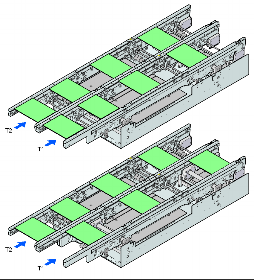 Kretskorten på transportspår 1 och 2 styrs synkront (d. v. s transportbanden är oberoende av var-