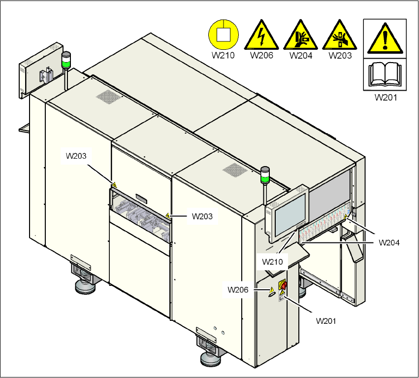 2 Driftsäkerhet Driftsinstruktion SIPLACE D1i/D2i 2.2 Varningsskyltar Från programve rsion SR.605.03 SP2 Utgåva 10/2012 SV 42 2 Bild 2.2 - 2 V arningsskyltar W203, W204 och W21 0 på automaten - del 2 Pos W203, artikelnr …