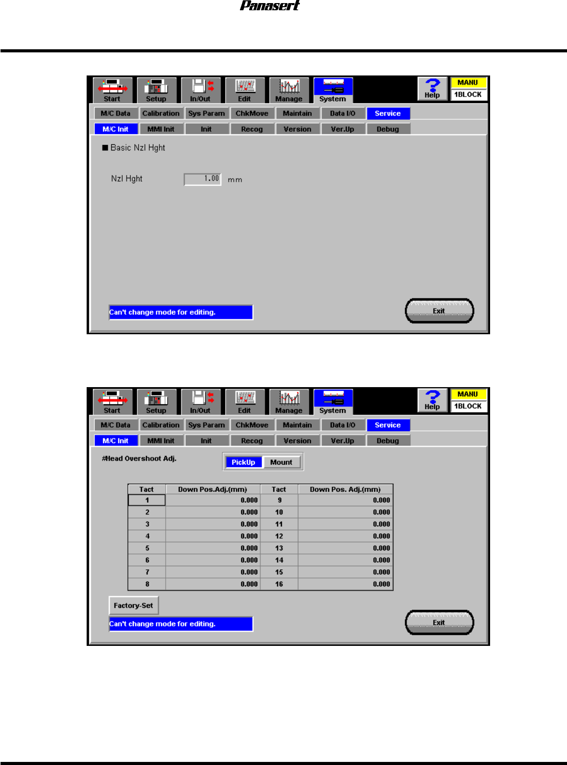 MSR 服务手册 6.1 秘密 画面服务功能 说明(机密事 项) D14SCC-85-0 80-A0 6.1-14 基准吸嘴高度画面 输入基准吸嘴的高度。 头超限修正画面 进行吸着侧、贴装侧的 头超限修正的 设定。