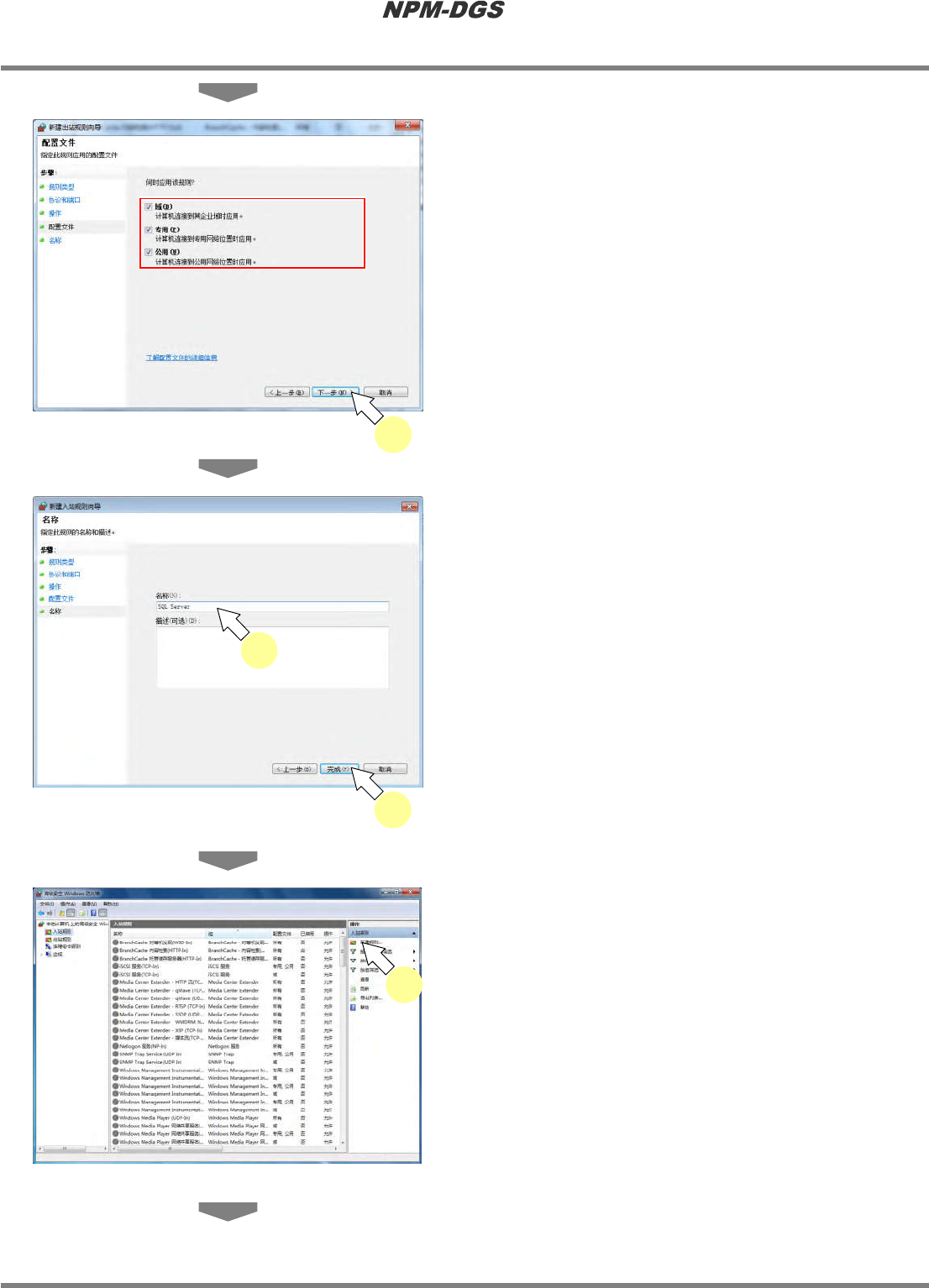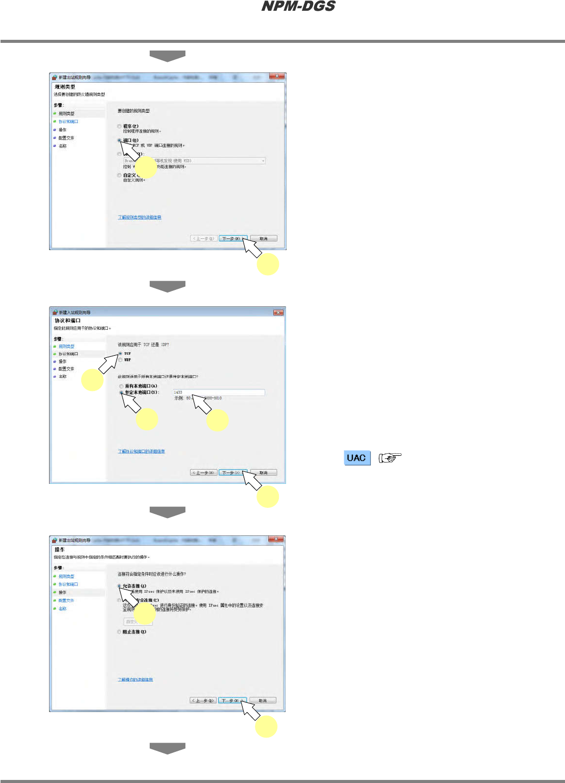 程序手册 2.1 NPM-DGS 的安装 EJS9AC-MB-02P-12 Page 2-63 3 点击 ‘ 端口 ’ 的确认按钮。 4 点击 [ 下一步 ] 。 5 点击 ‘TCP’ 的确认按钮。 6 点击 ‘ 特定远程端口 ’ 的确认按钮。 7 在 ‘ 特定远程端口 ’ 中输入 ‘1433’ 。 * 想要使用 1433 以外的端口时,输入相应 的 值。 端口的设定方法 : ( 2.1.6 SQL Server 2014/ 2012/…