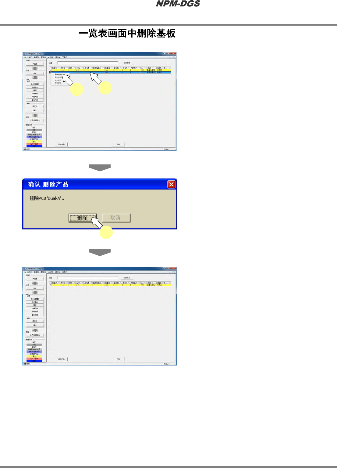 程序手册 7.3 PCB 一览表画面 EJS9AC-MB-07P-20 Page 7-95 7.3.4 PCB 1 选择要删除的生产数据。 2 选择右击菜单上的 [ 删除基板 ] 。 · 显示出确认删除的画面 。 3 删除所选择的生产数据时, 点击 [ 删除 ] 。 · 在 PCB 一览表画面中删除 所选择的生产数。 Product070102S-0 7C05 Product070803S-0 2C00 3 Product070304S…