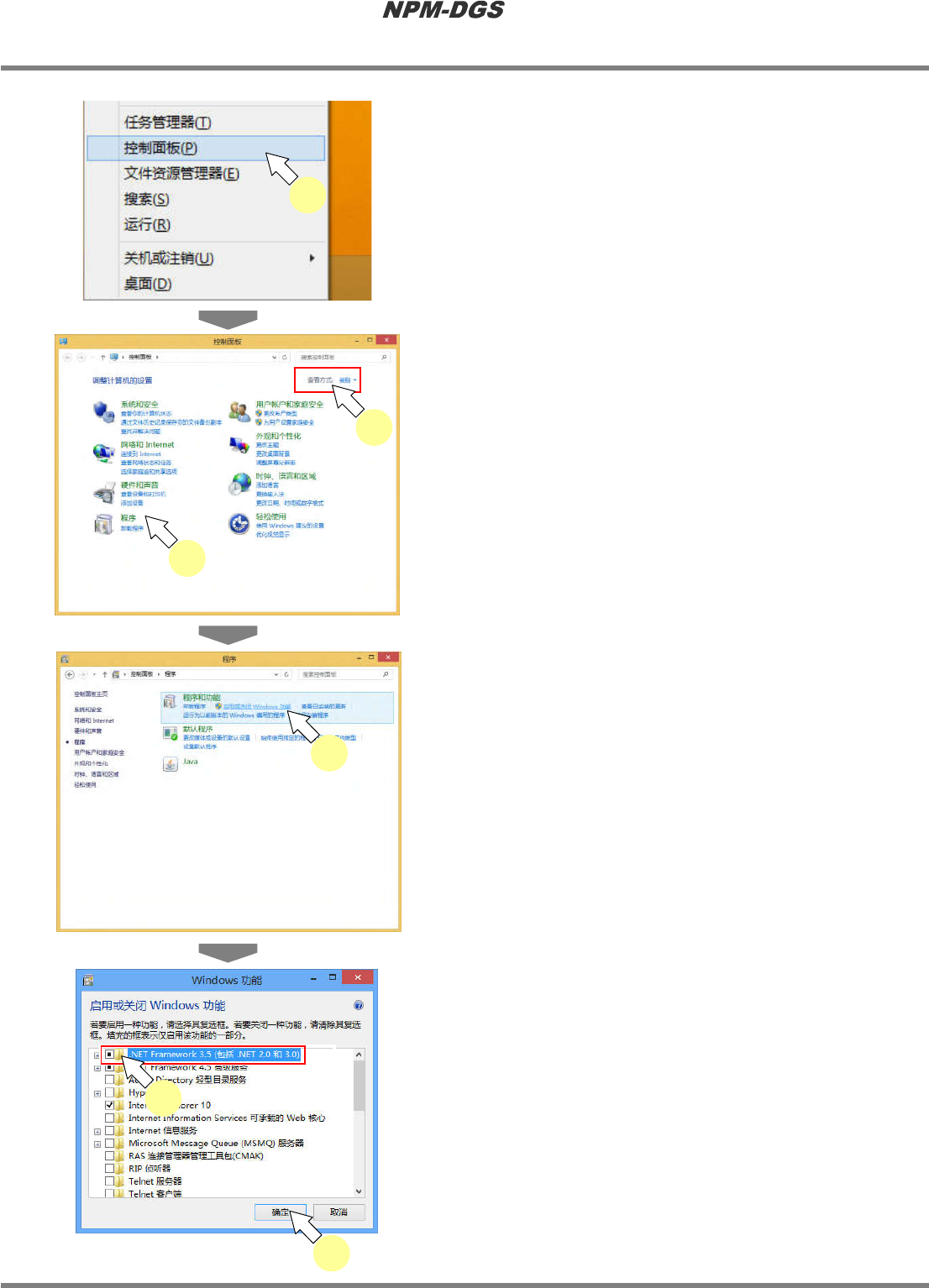 程序手册 2.1 NPM-DGS 的安装 EJS9AC-MB-02P-12 Page 2-69 B) OS 为 Windows 7 时 ① 防火墙的设定 关于防火墙的说明,请参照 ‘A) OS 为 Windows 8 时的 ①防火墙的设定 ’ 。 1 打开 [ 开始 ] ® [ 控制面板 ] 。 * 之后的步骤, 与 ‘A) OS 为 Windows 8 时的 ① 防火墙的设定 ’ 的步骤 3 ~ 35 相同。 ② 电源选项的设…