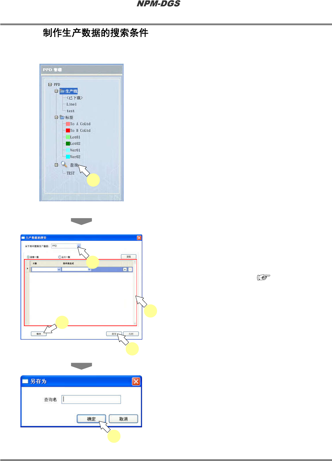 程序手册 9.2 关于 PPD 管理画面 Page 9-20 EJS9AC-MB-09P-14 9.2.12 n 查询生产数据 / 新建查询条件 1 选择导航区域的 [ 查询 ] 。 · 将显示查询生产数据的 窗口。 2 选择查询范围。 3 设定查询条件。 * 查询对象为 [ 生产数据名 ] 、 [ 批量名 ] 、 [ 编制日期 ] 、 [ 变更日期 ] 、 [ 标签 ] 、 [ 说明 ] 。 * 在以前版本的基础上进行了版本升级 时,…