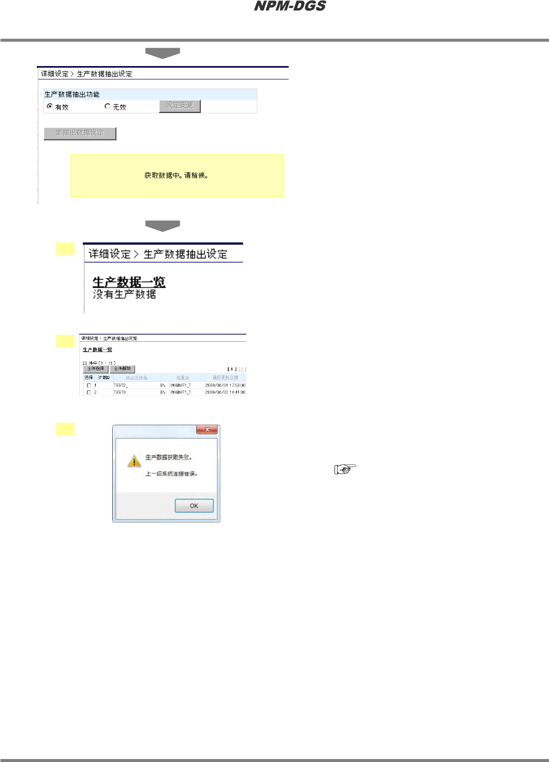 程序手册 2.1 NPM-DGS 的安装 EJS9AC-MB-02P-12 Page 2-89 · 将会变为数据获取中的 显示。 5 确认与 DGS 通信是否正常。 1) 虽然与 DGS 正常通信, 但是, 未能编制数据 时显示。 2) 与 DGS 正常通信, 并有编制完成的数据, 能 获取其一览时显示。 3) 未能与 DGS 通信时,将会显示 “ 生产数据获 取失败 ” 。 在这种情形下,请参照 下述章节的记载。 ‘14.1.3 与 …