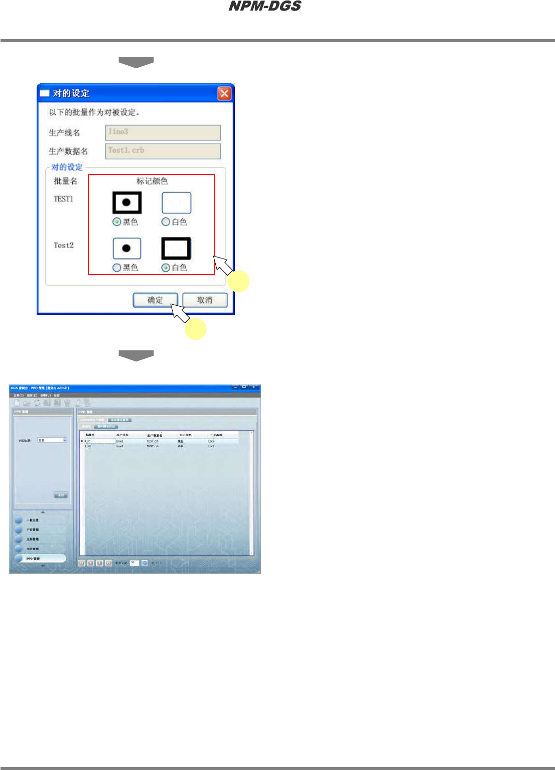 程序手册 9.3 生产数据的操作 Page 9-58 EJS9AC-MB-09P-14 6 设定各个批量的机种辨别标记颜色。 * 如果变更了一侧批量的 标记颜色,那么另一侧 也会自动改变。 7 点击 [ 确定 ] 。 · 在 ‘ 一对基板 ’ 栏内显示成对的基板名称和标记 颜色。 PPD090300S-0 5C04 PPD090300S-04C00 7 6