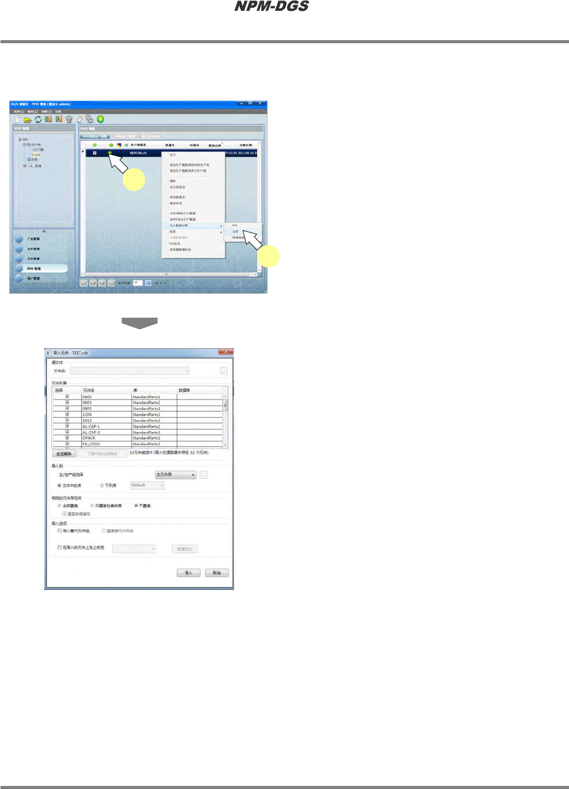 选择需要导入元件数据的生产数据。