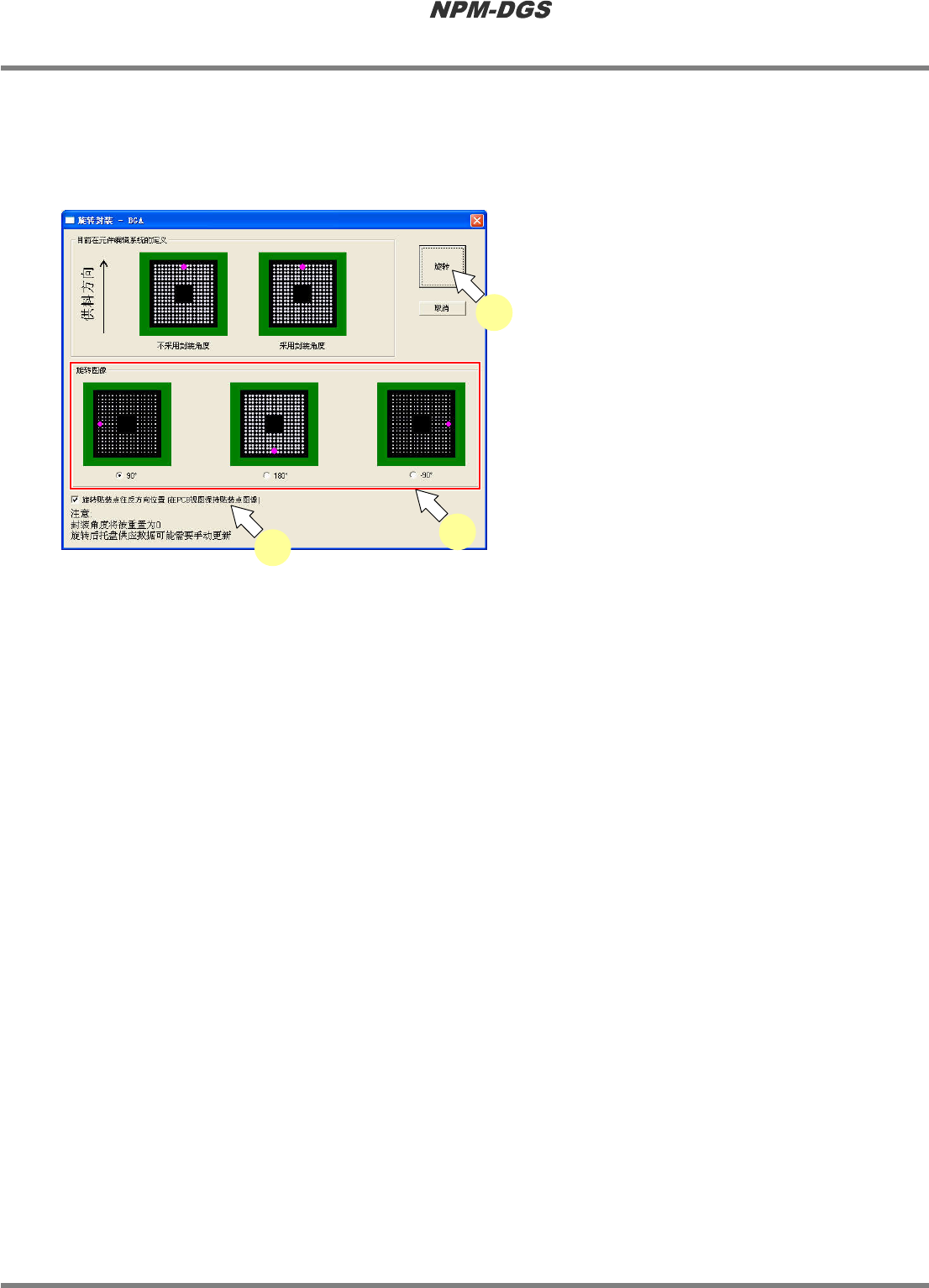 程序手册 9.4 关于项目编辑系统画面 EJS9AC-MB-09P-14 Page 9-97 n 旋转封装 旋转元件数据,以便使封装角度转 为 0 度。 在暂时决定了封装,并制作了元件数 据 的情形下,或需要将设定为 0 度以外的封装角度恢复 到 0 度时,使用本项功能。 1 选择旋转角度。 * 显示在旋转图像上的图 请选择与封装相同的 图。 2 确认贴装角度的旋转。 * 需要保持当前的贴装角 度时, 在 复选框内打勾, 这样将会以与元…