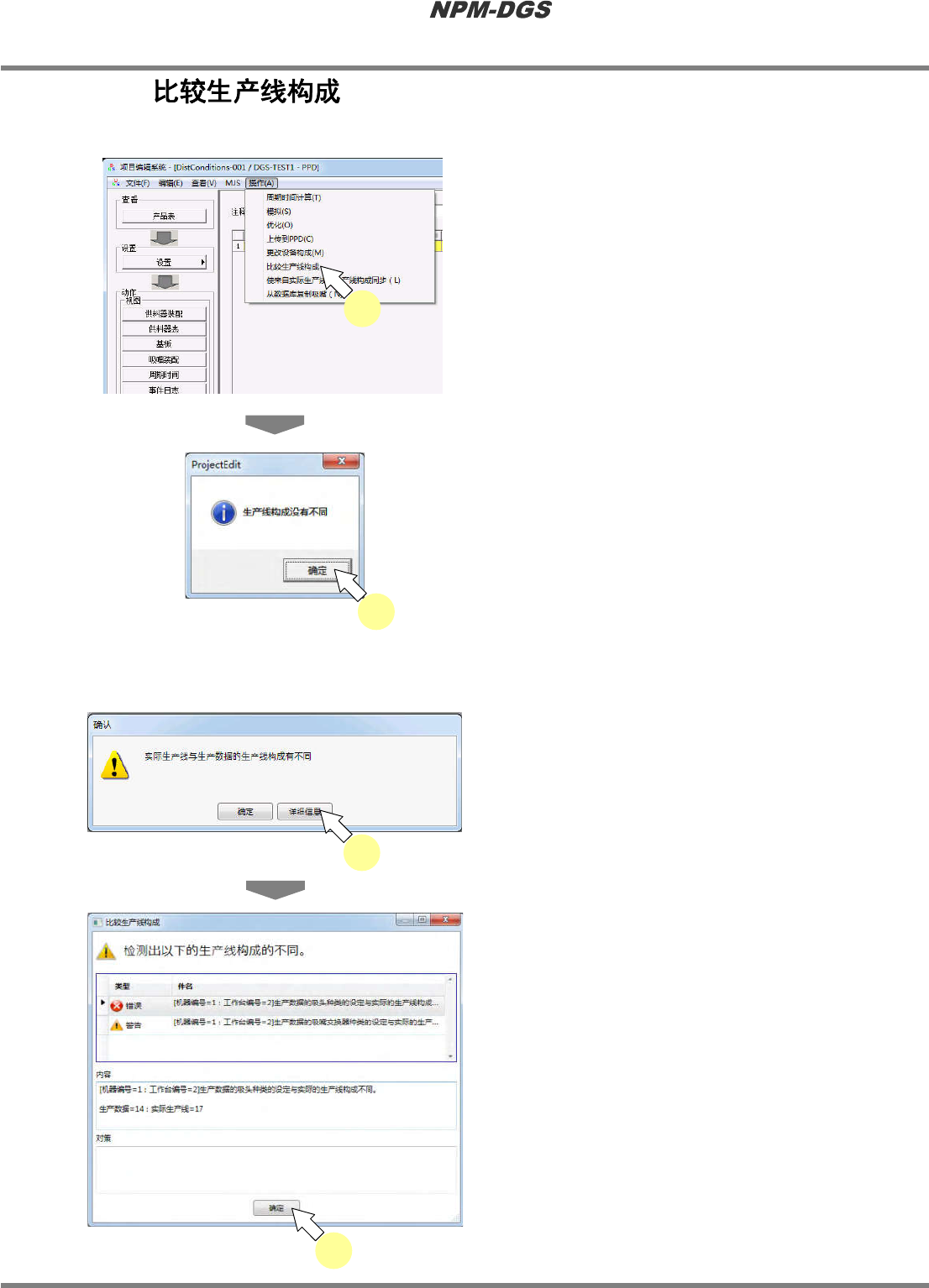 程序手册 9.6 生成数据 EJS9AC-MB-09P-14 Page 9-129 9.6.7 可对当前打开中的生产数据与实际生 产 线的构成进行比较。 1 选择菜单栏的 [ 操作 ] ® [ 比较生产线构 成 ] 。 * 当实际生产线与生产数 据的生产线构成存在不 同时,将显示如所左所 示的画面。当生产线构 成不同时,请参照后述 的 ‘ ■生产线构成不同 时 ’ 。 2 点击 [ 确定 ] 。 · 将返回到 PPD 编辑器。 n 生产…