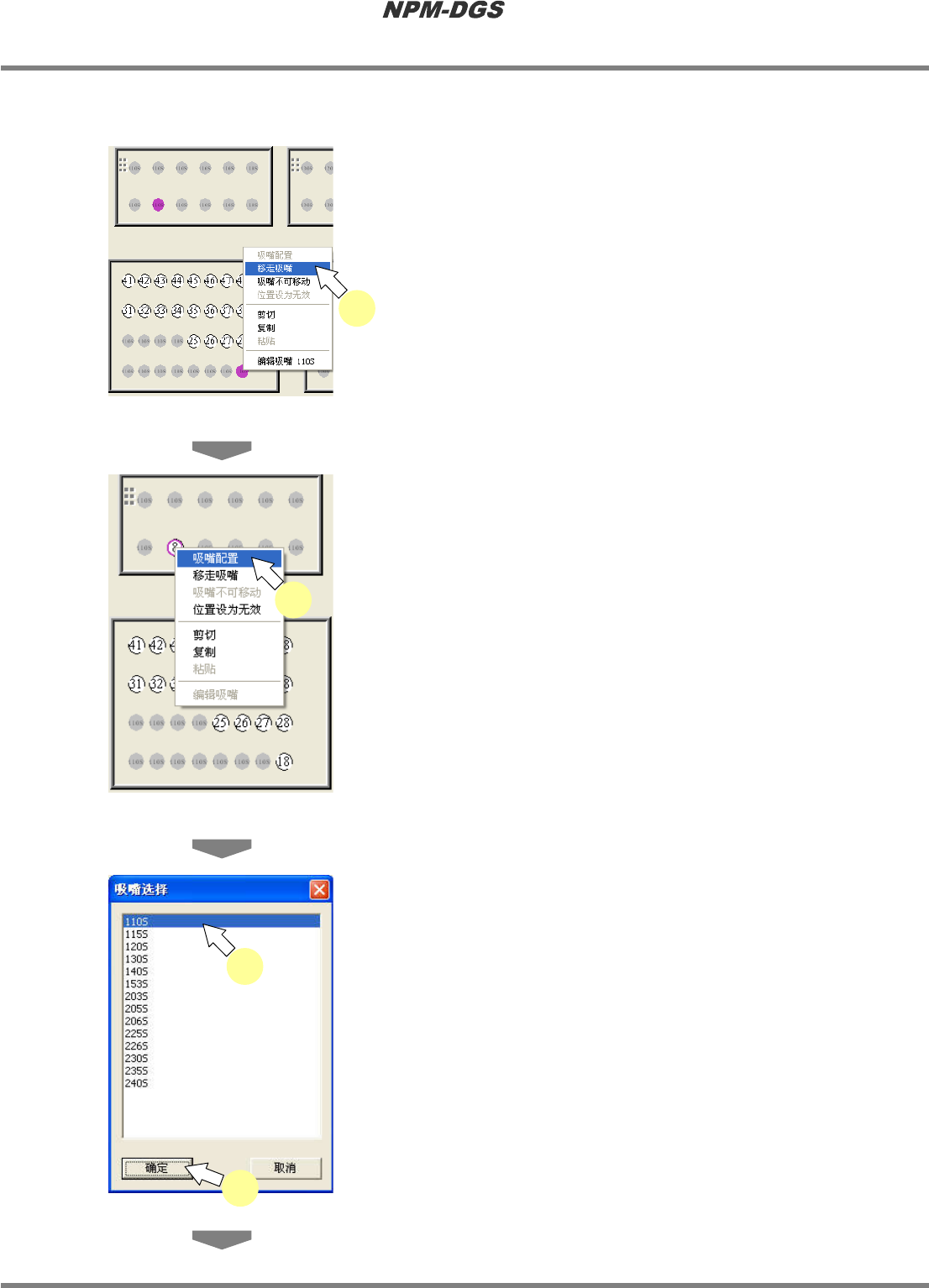 程序手册 10.3 编辑数据的技巧 Page 10-14 EJS9AC-MB-10P-11 n 16 吸嘴头、 12 吸嘴头的情形 1 在吸嘴配置画面上, 右点击需要变更的 工作台上吸嘴头的吸嘴后, 选择 [ 移走吸 嘴 ] 。 * 请移走在吸嘴头上过多 安装的吸嘴。如果在吸 嘴头上只存在少数的需 要移走的吸嘴,那么每 个吸嘴所吸附的元件数 会增加,从而有可能导 致 TACT TIME 变得非常长。 * 如果在吸嘴头上只安装 了一个需要…