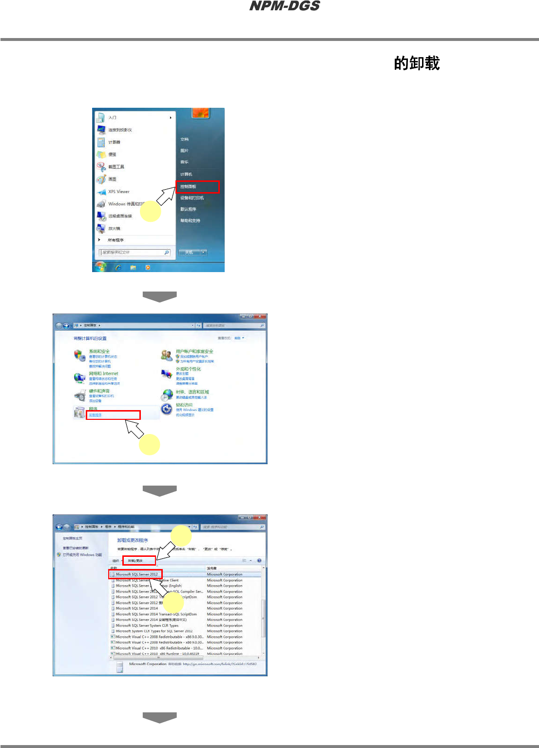 程序手册 2.2 DGS 应用程序的升级 EJS9AC-MB-02P-12 Page 2-105 2.2.7 SQL Server Managem ent Studio Express n SQL Server 2012 Management Studio Express 的卸载 1 点击 [ 开始 ] ® [ 控制面板 ] 。 2 点击 [ 卸载程序 ] 。 3 选择需要卸载的 Microsoft S QL Server 2012 后…