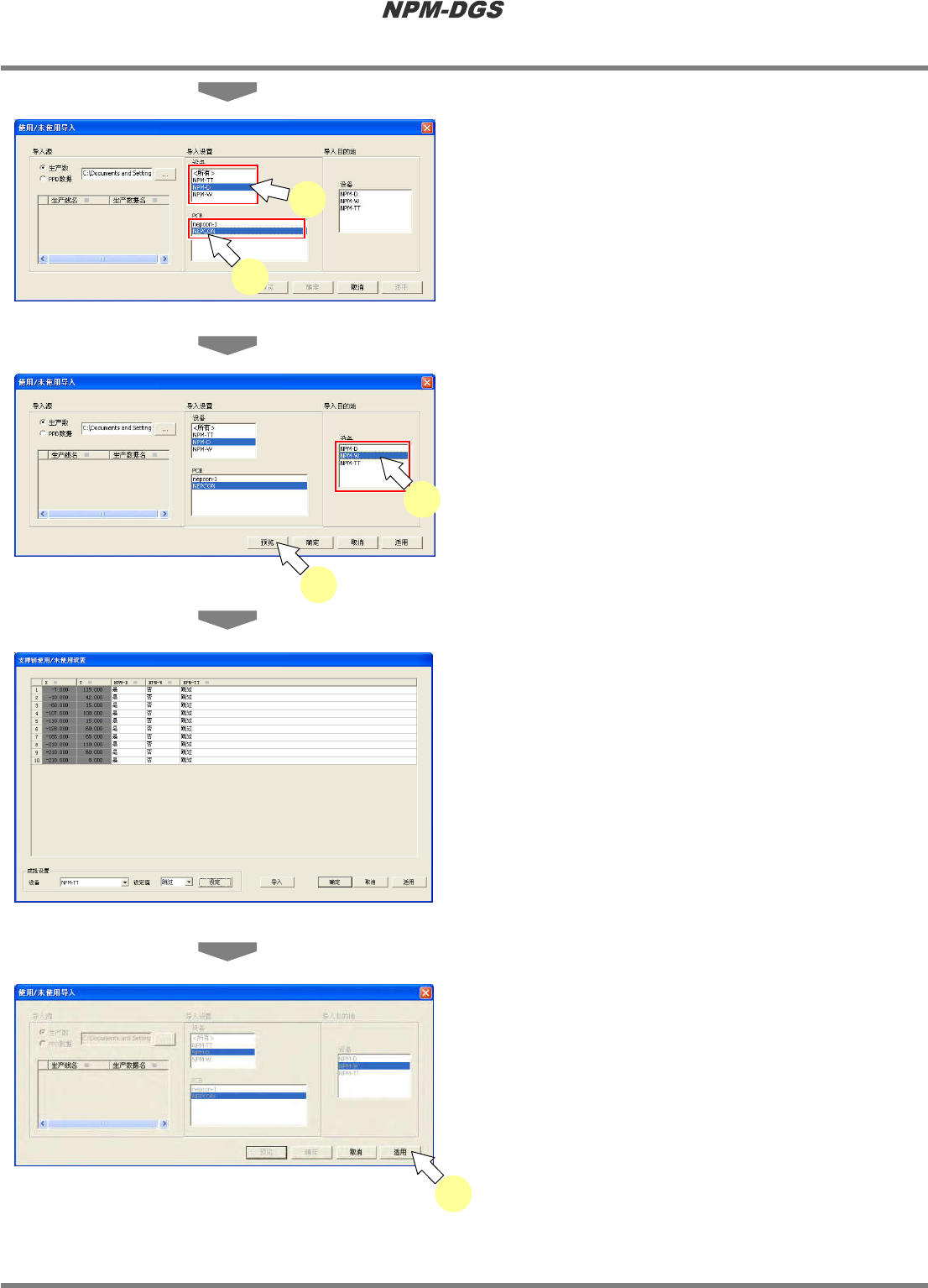 程序手册 13.2 支撑销配置数据的编制功能 Page 13-62 EJS9AC-MB-13P-19 6 选择 ‘ 设备 ’ 。 7 选择 ‘PCB’ 。 * 将在导入的设定画面上 ,显示包含在生产数据 中的 PCB 一览。 8 选择导入目的地的 ‘ 设备 ’ 。 * 选择导入目的地后, [ 预览 ] 、 [ 确定 ] 、 [ 使用 ] 即会 转为可选择的状态。 * 此时,如果点击 [ 确定 ] 或 [ 使用 ] ,可不进行预 览而进行…