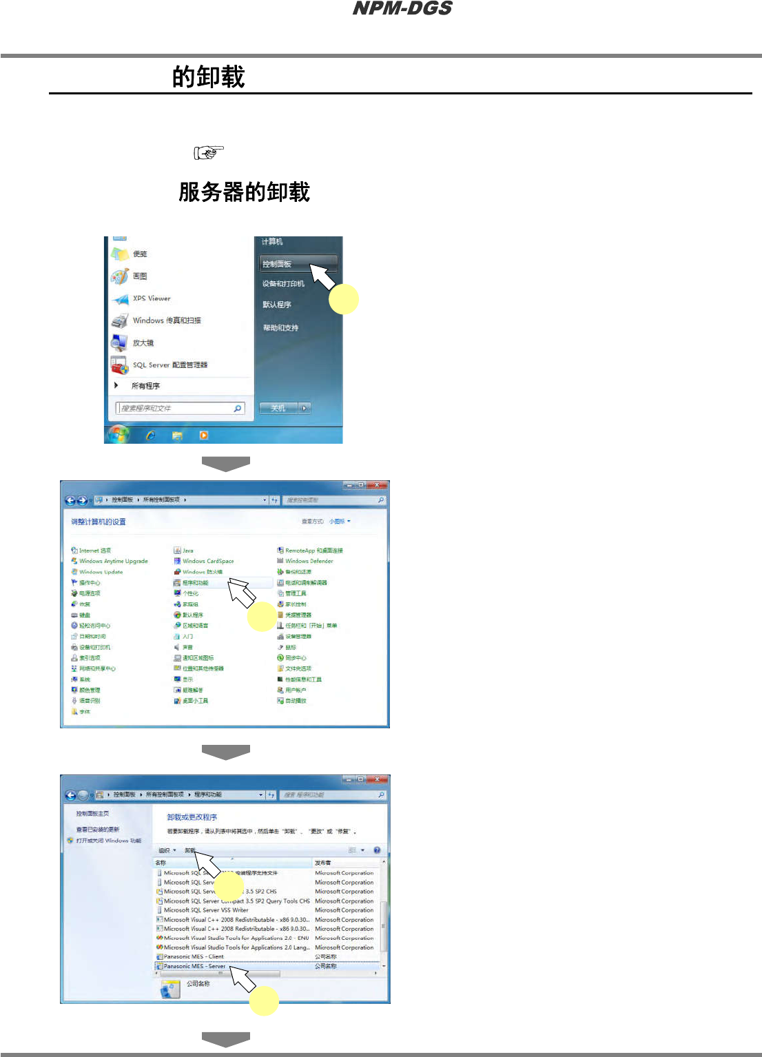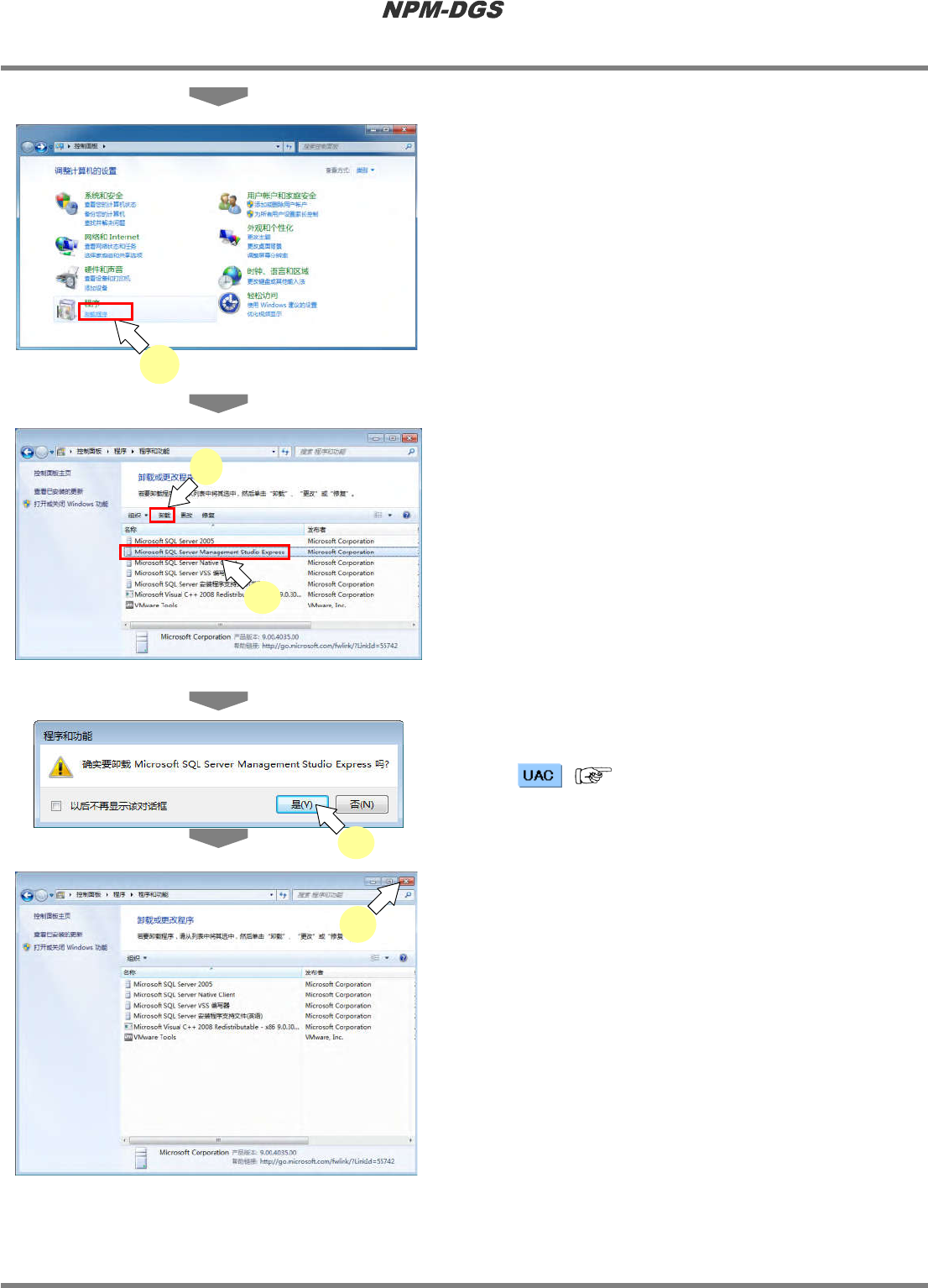 程序手册 2.2 DGS 应用程序的升级 Page 2-112 EJS9AC-MB-02P-12 2 点击 [ 卸载程序 ] 。 3 选择需要卸载的 Microsoft S QL Server Management Studio Express 后,点 击 [ 卸载 ] 。 4 点击 [ 是 ] 。 * ( ‘1.3.1 关于用户帐户控制’ ) 5 关闭 < 程序和功能 > 画面。 Install020101S- 143C0…