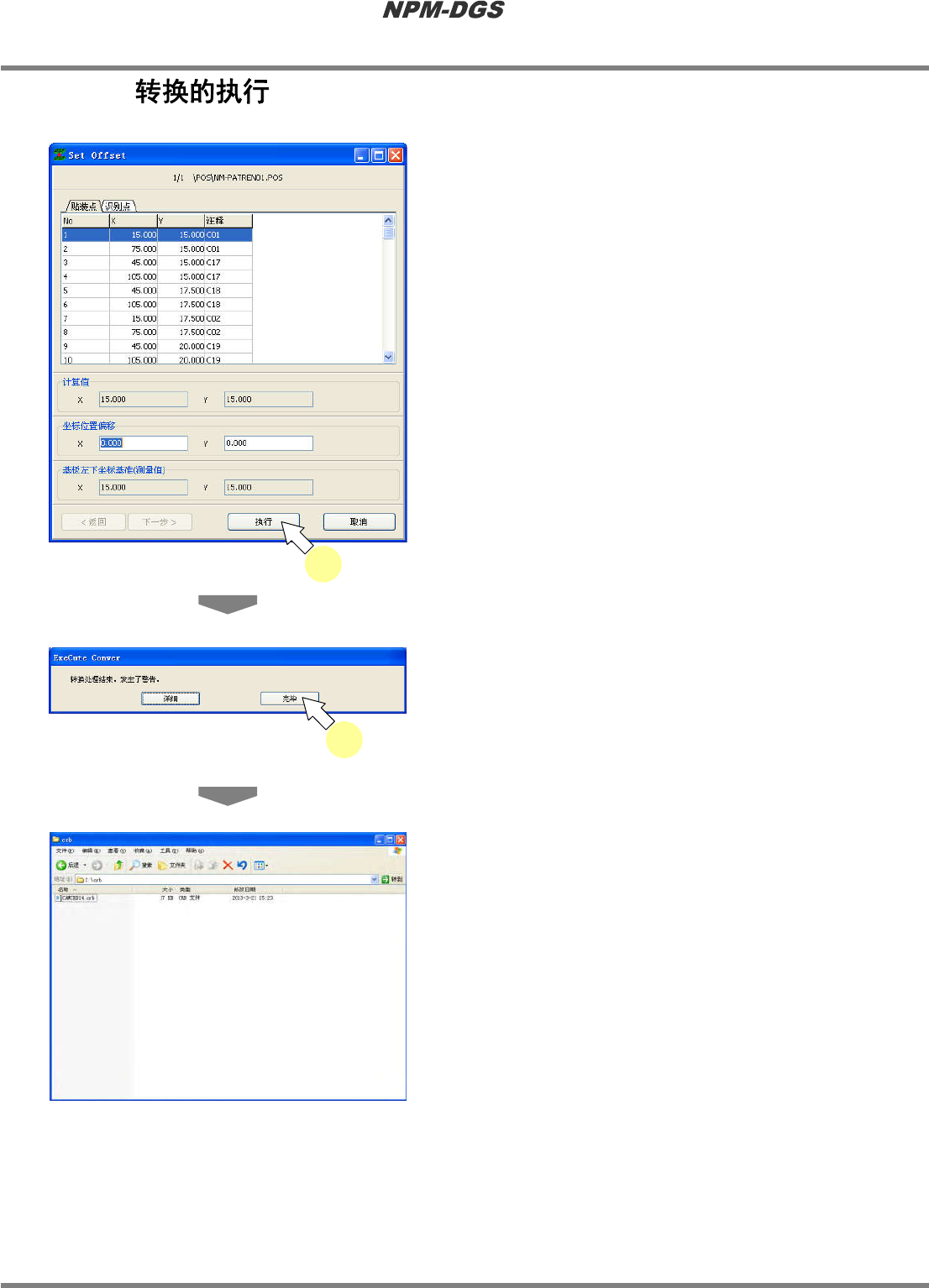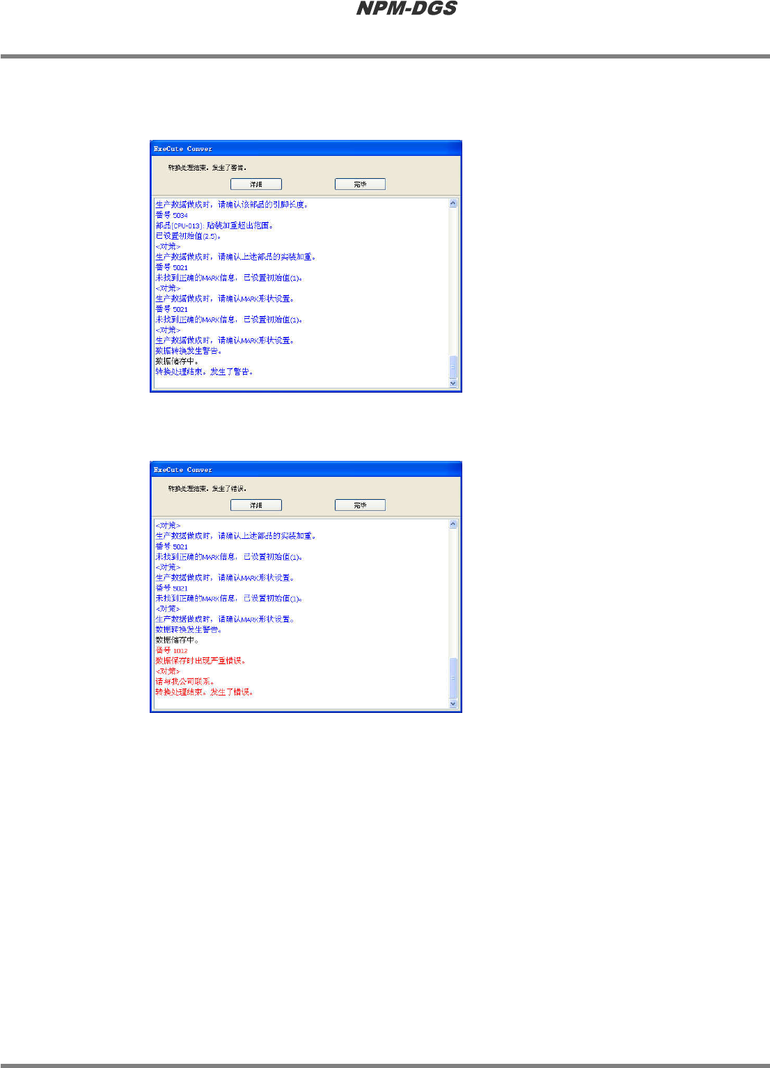 程序手册 13.5 SCAP (Special Conv ert A Panasert) Page 13-102 EJS9AC-MB-13P-19 13.5.10 1 设定偏移值后,点击 [ 执行 ] 。 · 将执行转换,并显示转 换结果对话框。 * 在转换对话框中存在下 述 3 种状态。 正常 : 转换正常结束。 警告 : 转换虽然完成, 但是 存在一部分不正 确的数据, 因此设定了 DGS 的标准 值。 请在 DGS 导入后,确认该…