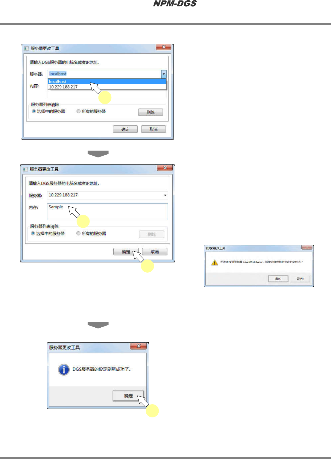 程序手册 13.7 服务器更改工具 Page 13-112 EJS9AC-MB-13P-19 13.7.4 在这项功能下,可从历史中删除不再 使 用的连接服务器。 n 删除选择的服务器 1 从下拉菜单中选择想要删除的服务器。 * 将显示以往更改过的服 务器列表。 ( 最多 20 项 ) 2 选择 ‘ 选择中的服务器 ’ 或 ‘ 所有的服务 器 ’ 。 · 请确认以下事项后选择 。 ‘ 选择中的服务器 ’: 只删除在下拉菜单上选 择的服务…