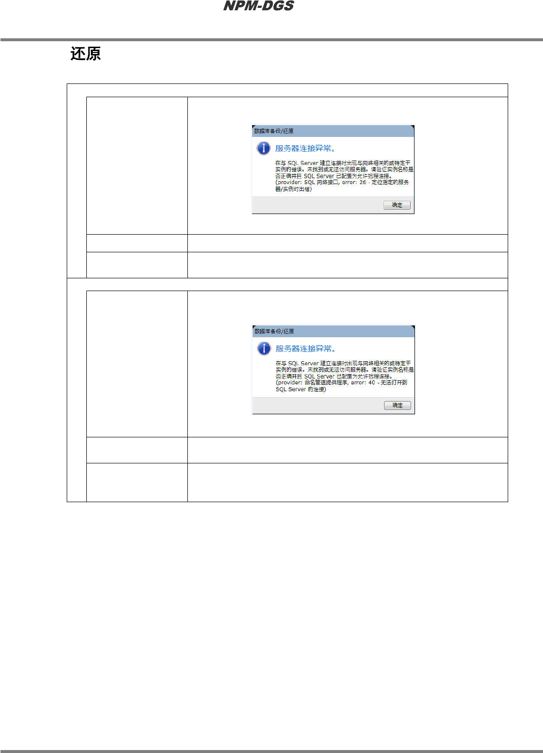 程 序手册 14 . 1 故障排除 Pag e 14-8 EJS9 AC-MB-14P-03 14.1.4 n 数据库的备份 / 还原 现象 : 在 服务器客户端 系统下,备份 或还原数 据库时,服 务器连 接发生异常。 错误信息 “p ro vi der : SQL 网络接口 , error : 26 – 定位 指定的服务 器 / 实例时 出错。 ” 原因 服务器侧的 SQL Se rver Brow er 的服务没有开 始。 对策 …