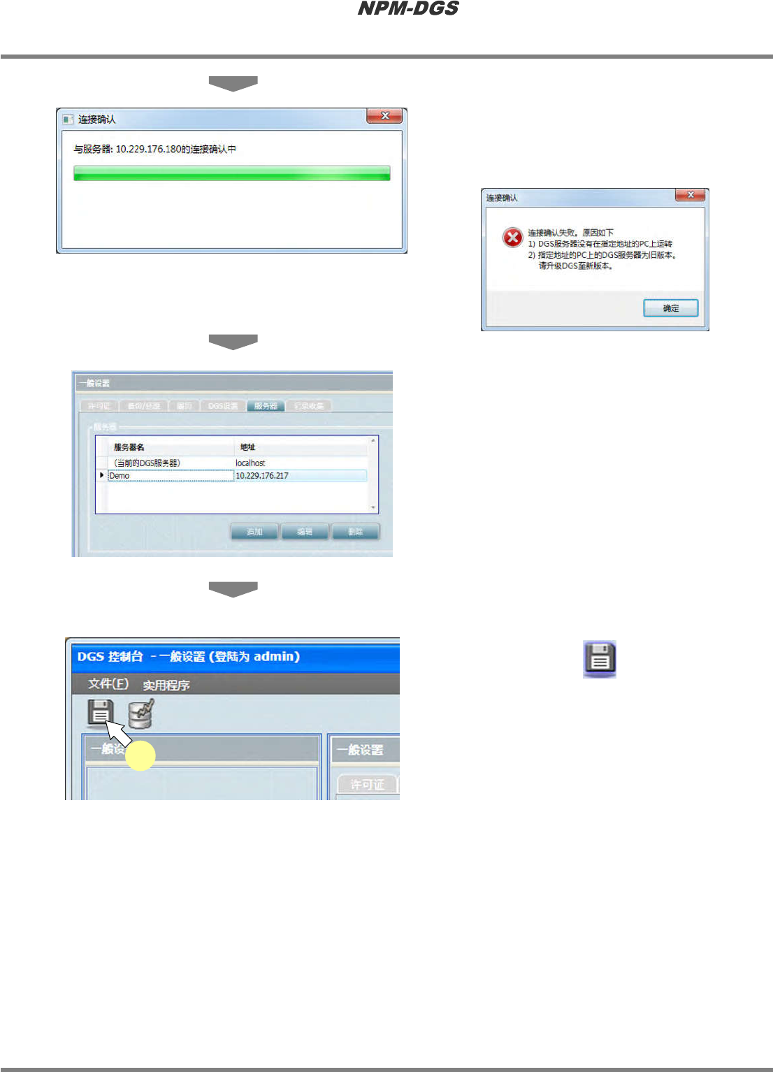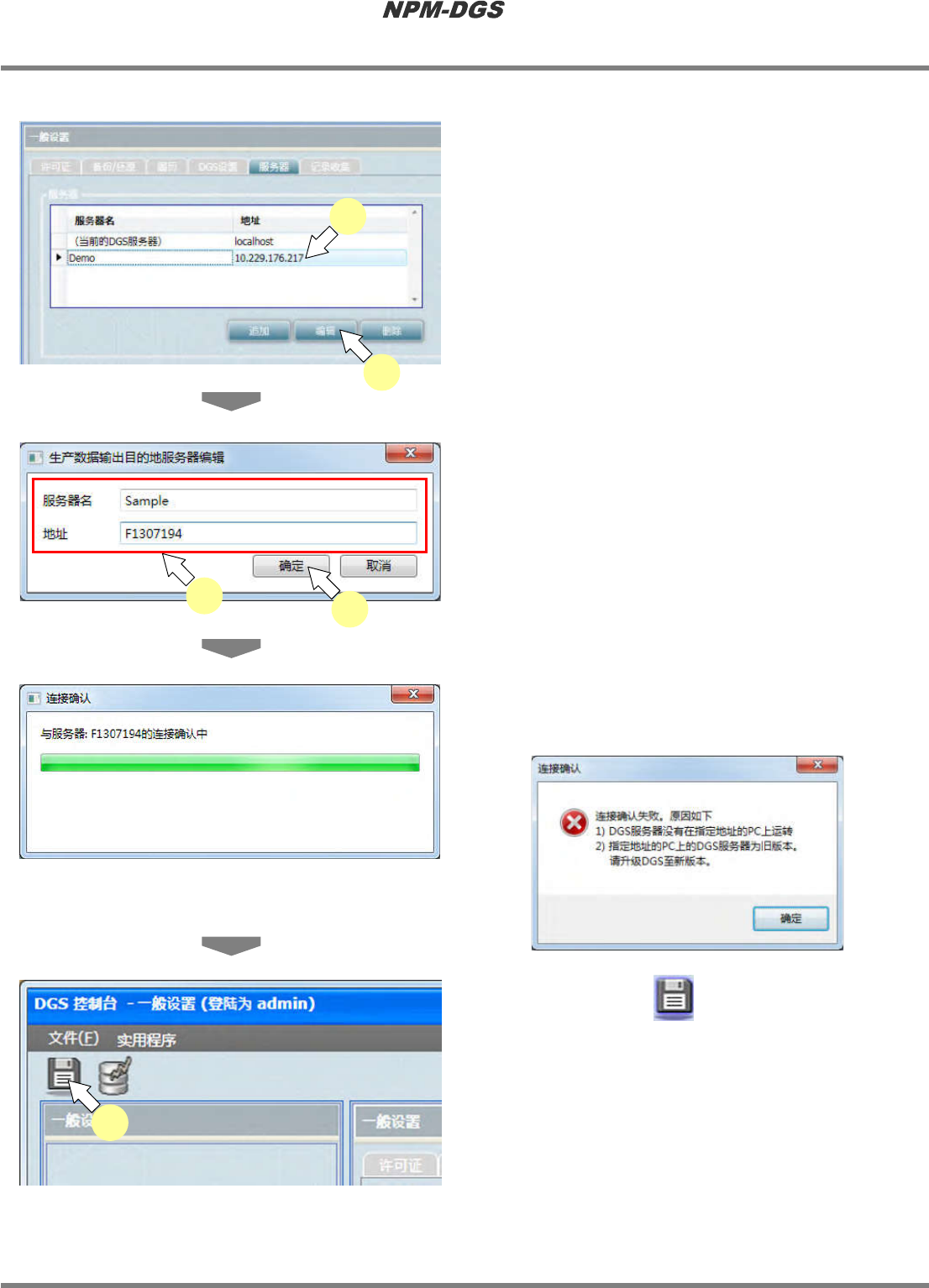 程序手册 3.2 关于环境设定画面 EJS9AC-MB-03P-11 Page 3-29 · 对所设定的地址执行连 接确认。 * 连接失败时,将显示以 下的错误对话框。请重 新确认服务器名 / 地址设定中是否有误。 · 连接成功时,将追加到 服务器一览中。 4 点击工具栏的 ( 保存 ) 。 Environment030204S-07C00 Environment030204S-09C00 Environment030204S-08C0…