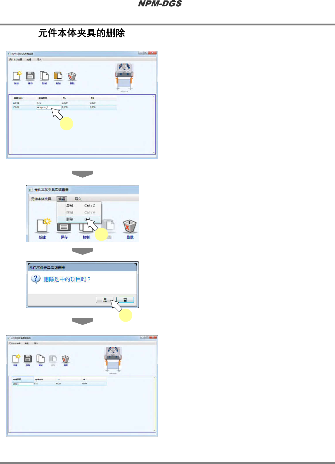 程序手册 4.8 元件本体夹具库编辑器 Page 4-94 EJS9AC-MB-04P-21 4.8.6 1 选择需要删除的元件本体夹具。 2 选择菜单栏的 [ 编缉 ] → [ 删除 ] 。 3 选择 [ 是 ] 。 · 将删除元件本体夹具数 据。 Factory041000S-14C00 1 Factory041000S-15C00 2 Factory041000S-16C00 3 Factory041000S-17C00