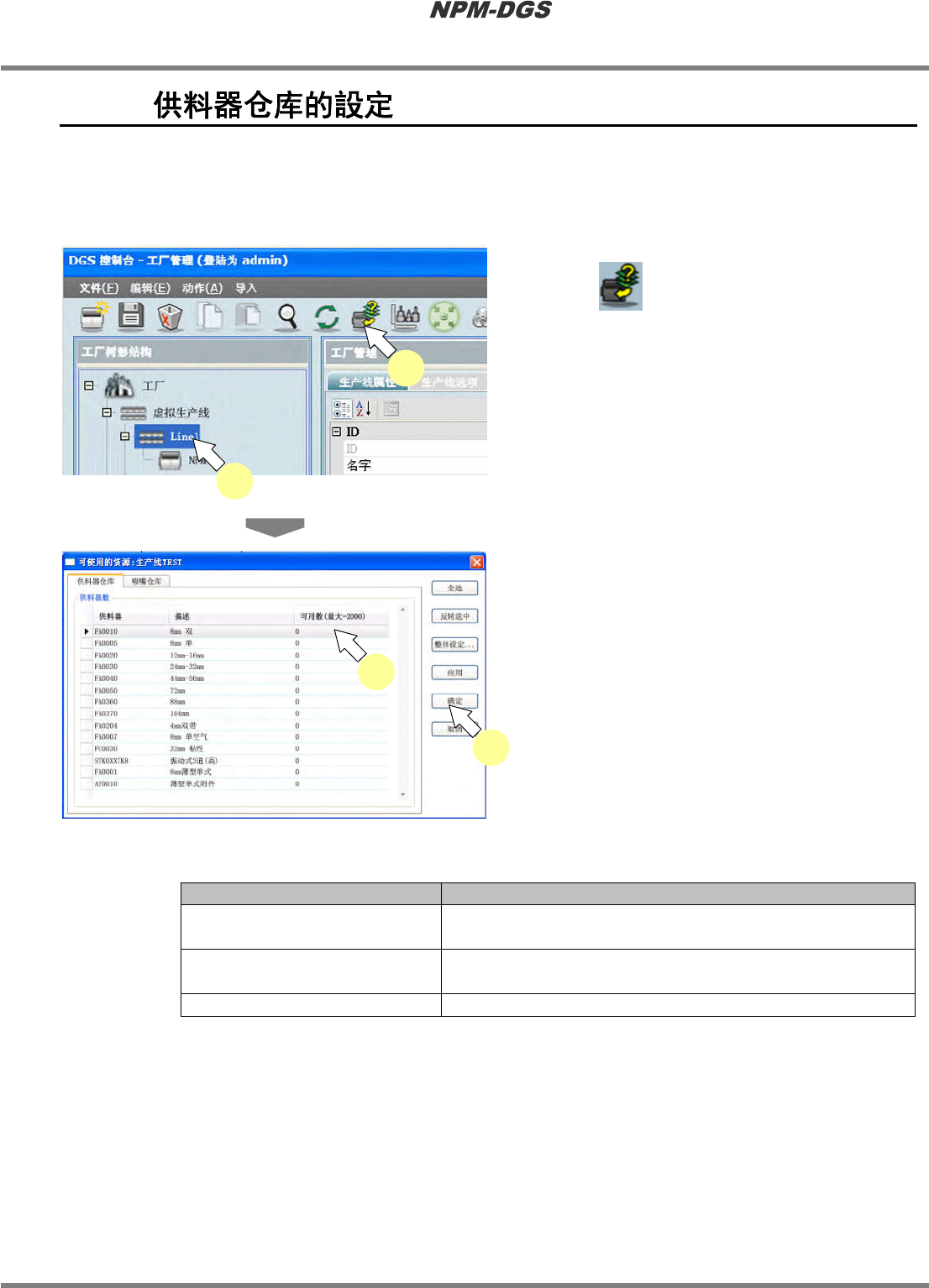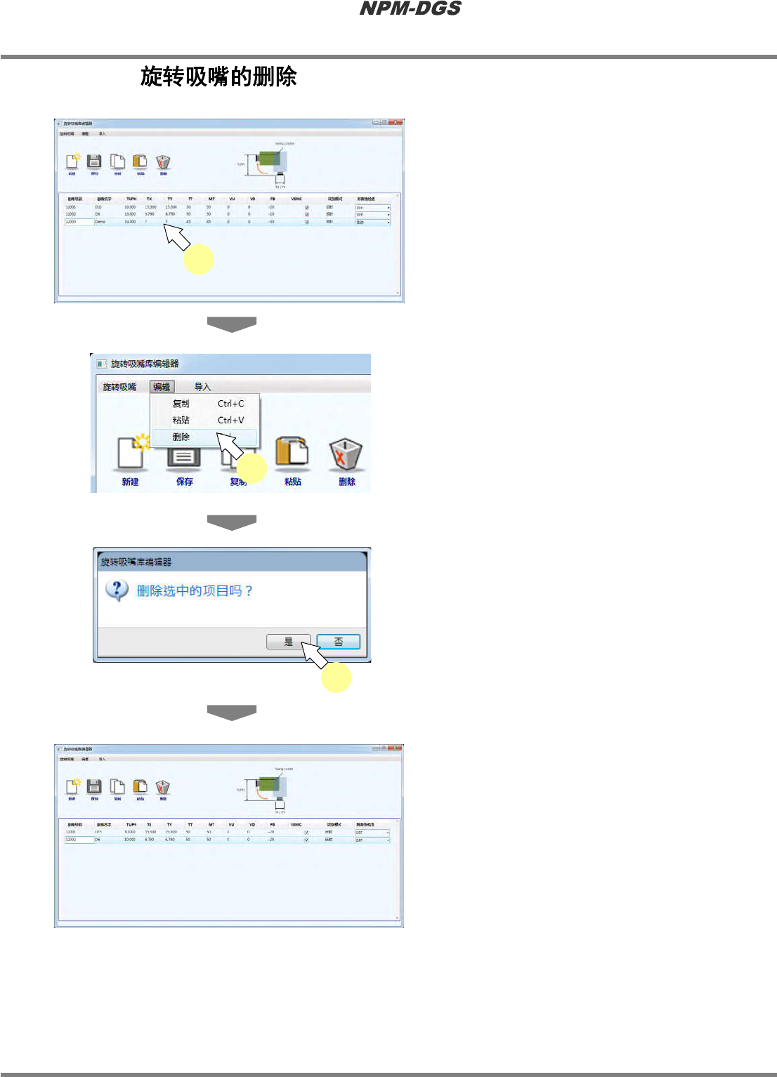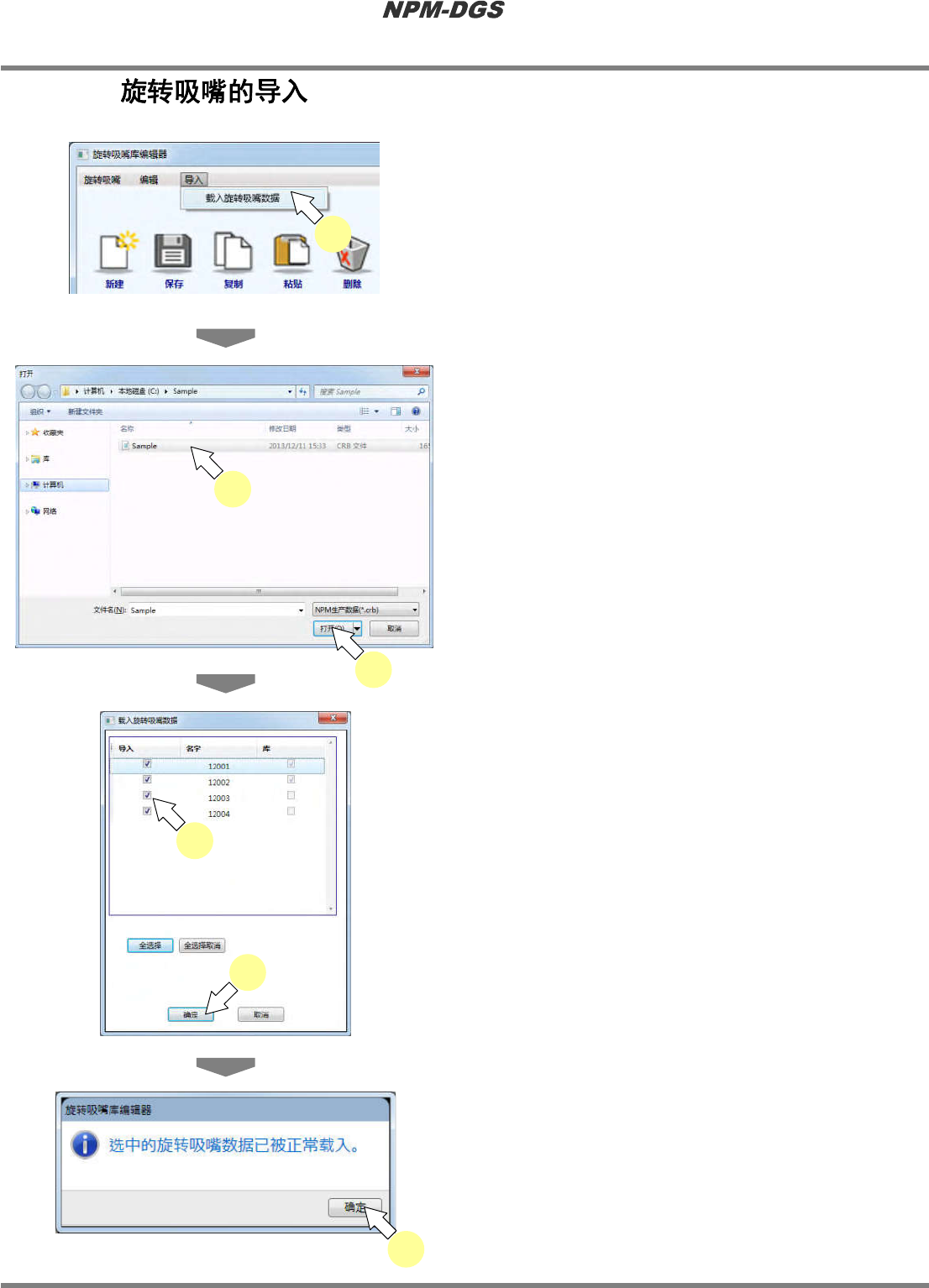 程序手册 4.10 旋转吸嘴库编辑器 Page 4-112 EJS9AC-MB-04P-21 4.10.7 1 选择菜单栏的 [ 导入 ] → [ 载入旋转吸嘴 数据 ] 。 2 选择需要导入的生产数据。 3 点击 [ 打开 ] 。 · 将显示确认画面。 4 勾选需要导入的旋转吸嘴。 5 点击 [ 确定 ] 。 6 点击 [ 确定 ] 。 Factory041 2 00S - 20 C 00 4 5 Factory041200S-21C…